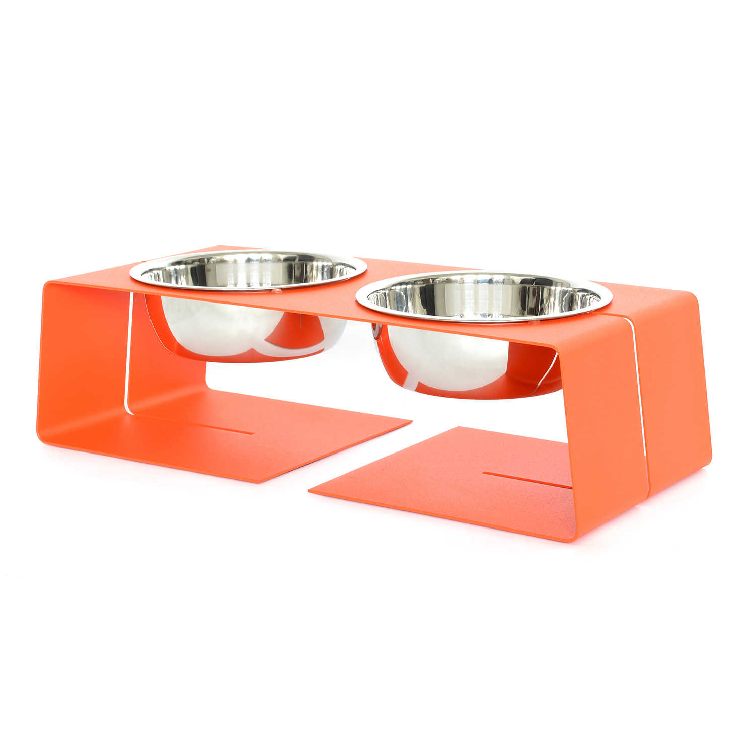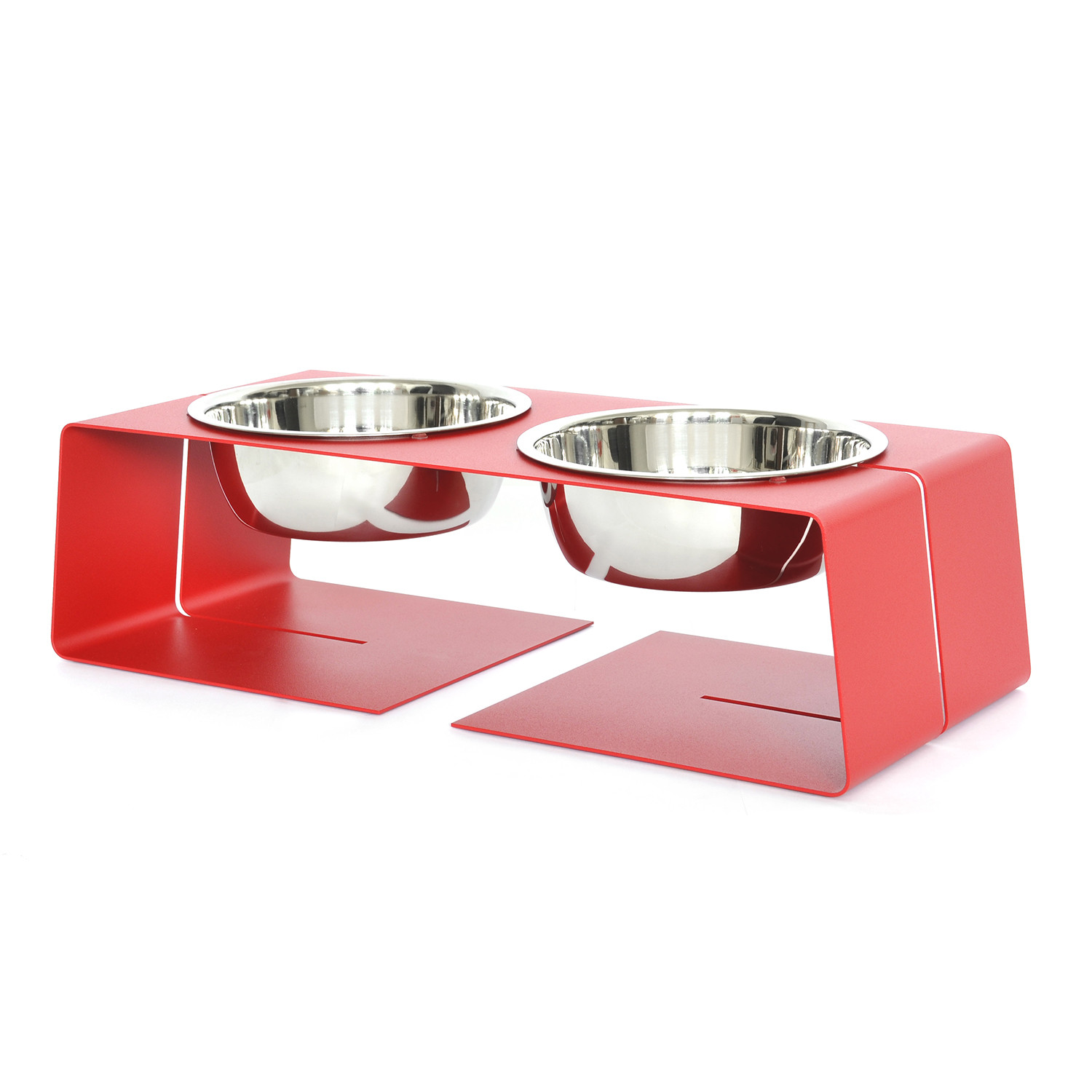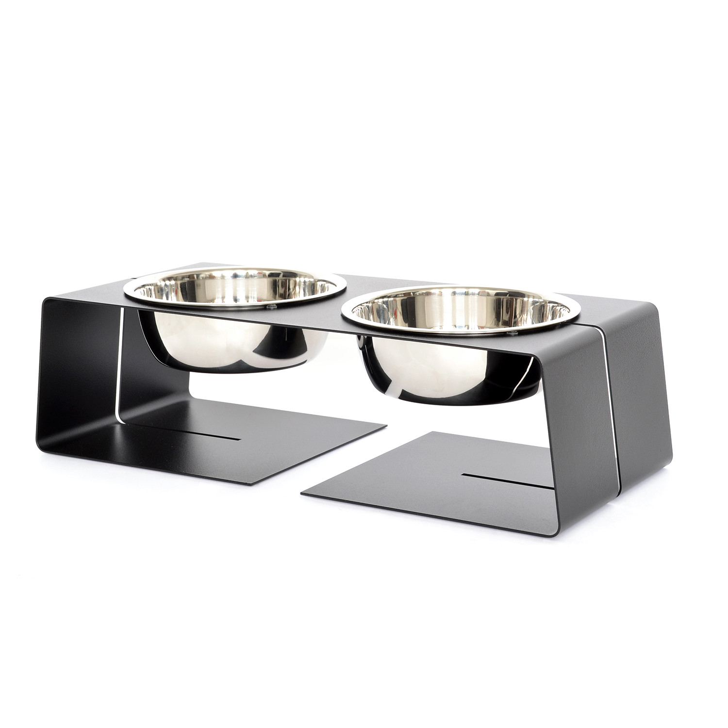 These minimal powder coated steel pet bowl holders have a textured finish that resists scratches and a rubber non-skid bottom. These stylish feeders keep your beloved pet's food and water off the ground too. They are the perfect modern pieces for any contemporary, pet-friendly household.