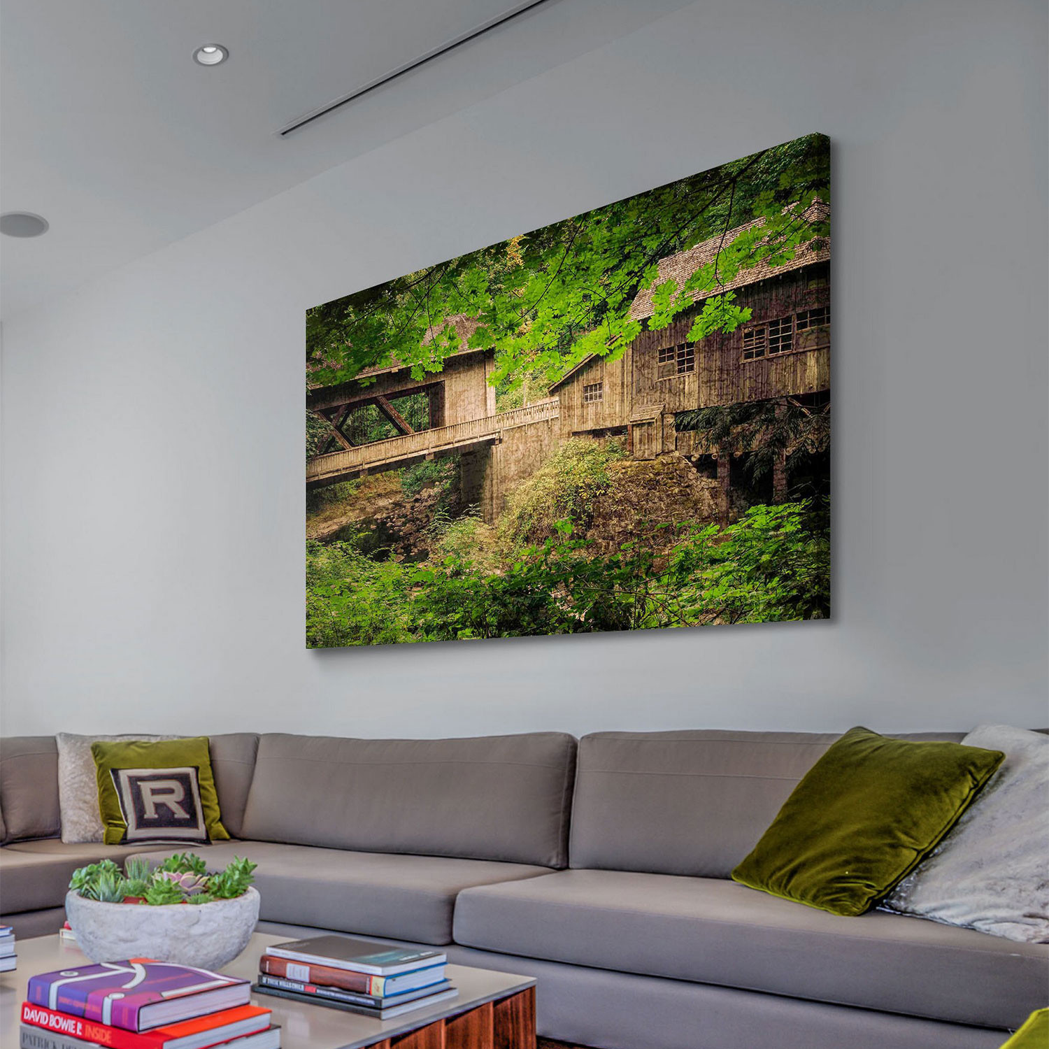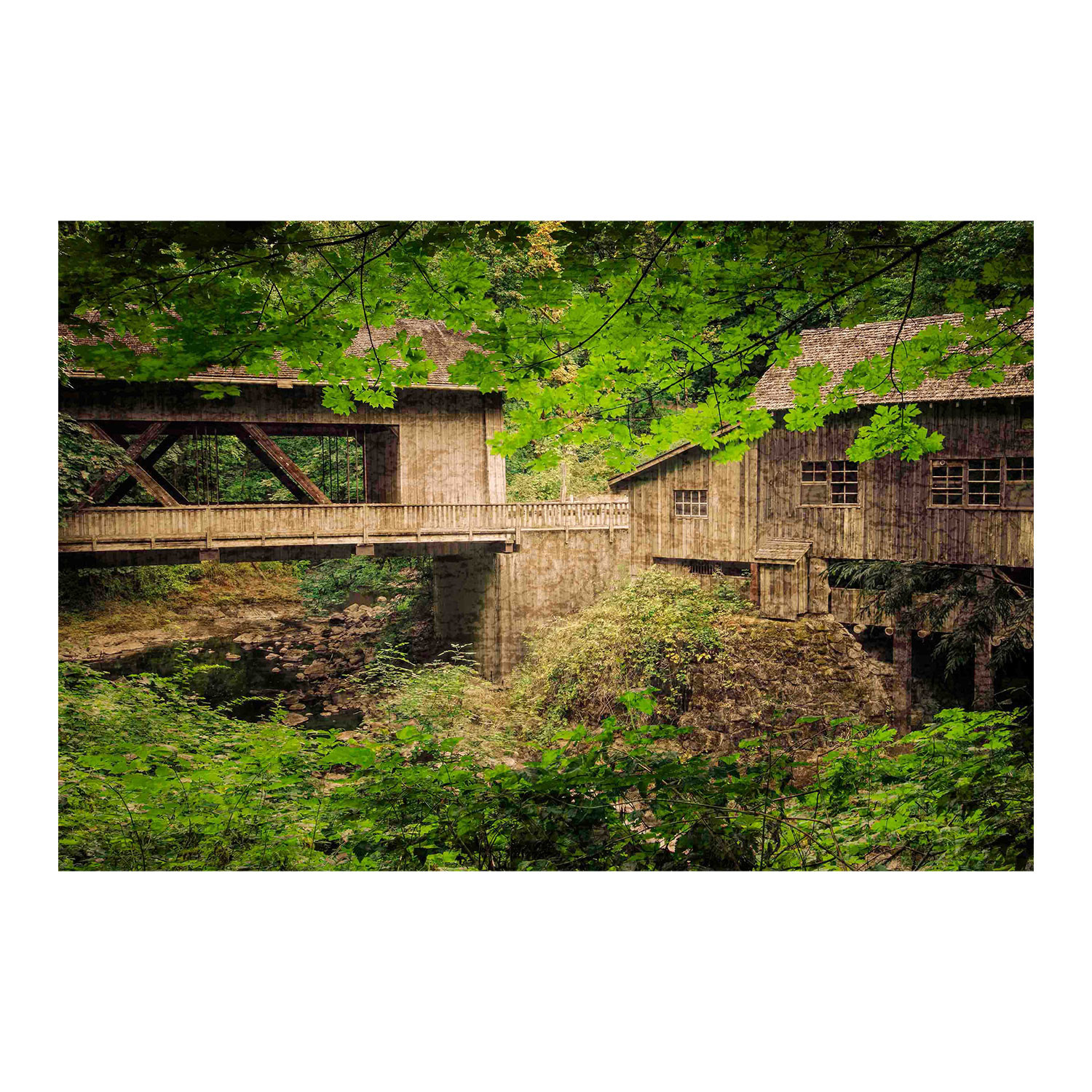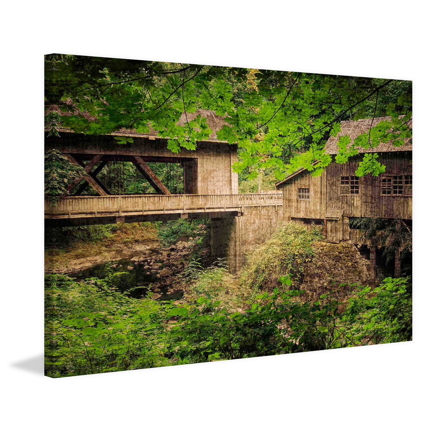 Cedar Mill and Covered Bridge // Painting Print on Wrapped Canvas