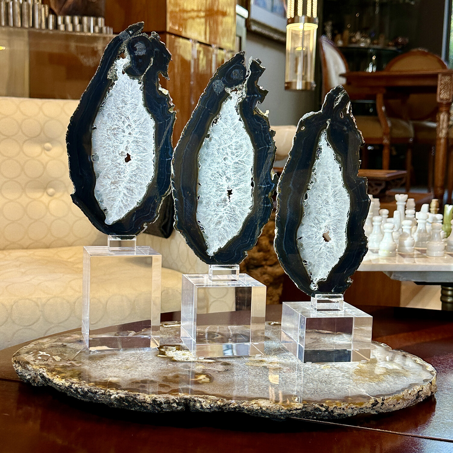 Introducing a set of three exquisite sculptures made from the finest quality agate, sourced directly from Brazil. Each piece is expertly crafted to create a stunning and unique work of art that is sure to enhance any space. Mounted on sleek and modern plexi bases, these sculptures appear to be floating in mid-air, adding to their already impressive visual appeal.
