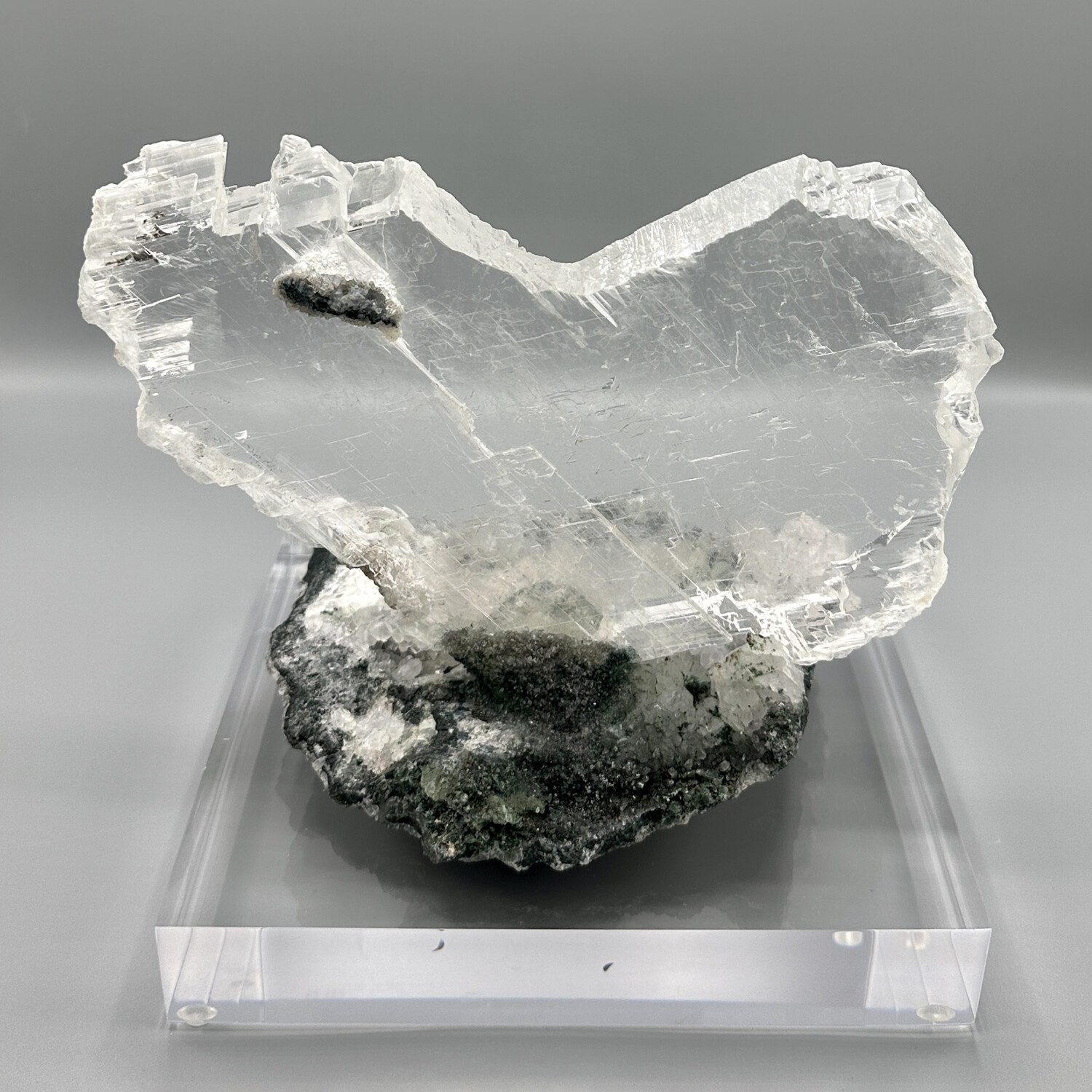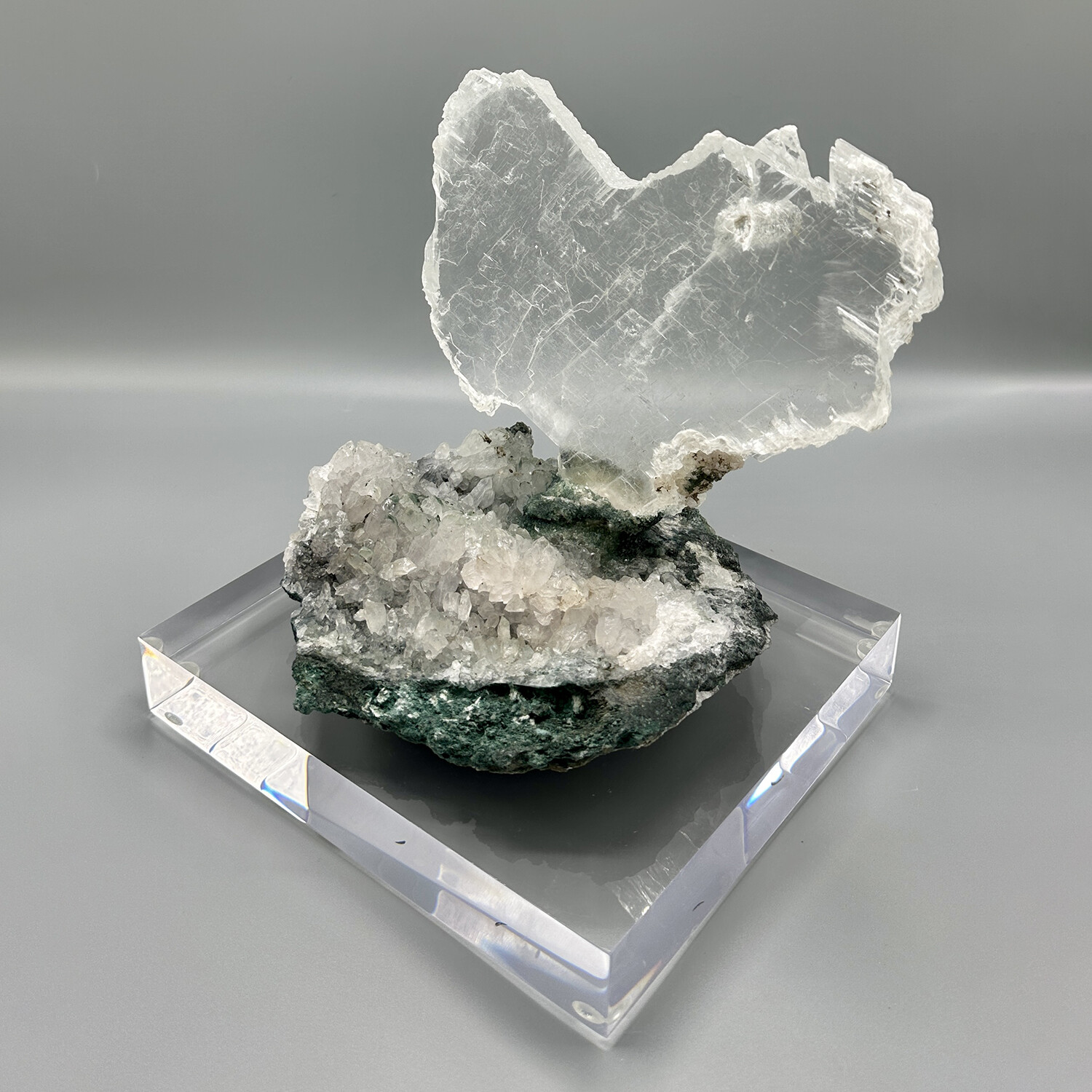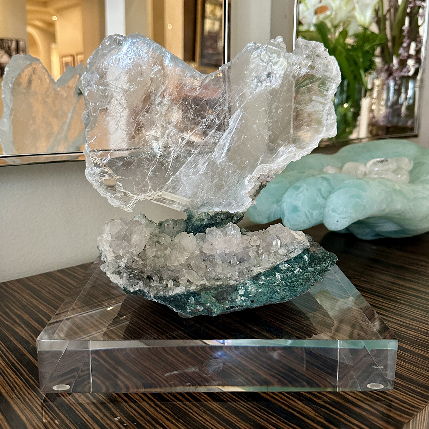 Introducing a magnificent sculpture crafted from the finest quality gypsum and selenite, expertly combined to create a truly unique piece of art. Mounted on a sleek and modern plexi base, this sculpture appears to be floating in mid-air, adding to its already impressive visual appeal.