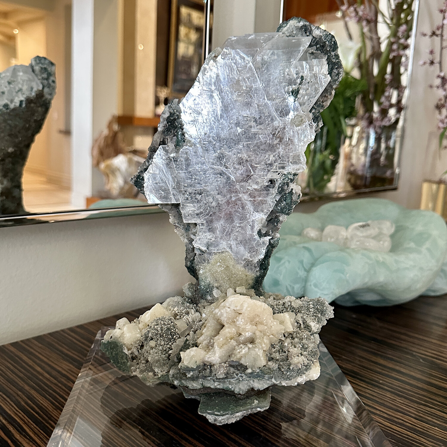 Introducing a magnificent sculpture crafted from the finest quality gypsum and selenite, expertly combined to create a truly unique piece of art. Mounted on a sleek and modern plexi base, this sculpture appears to be floating in mid-air, adding to its already impressive visual appeal.