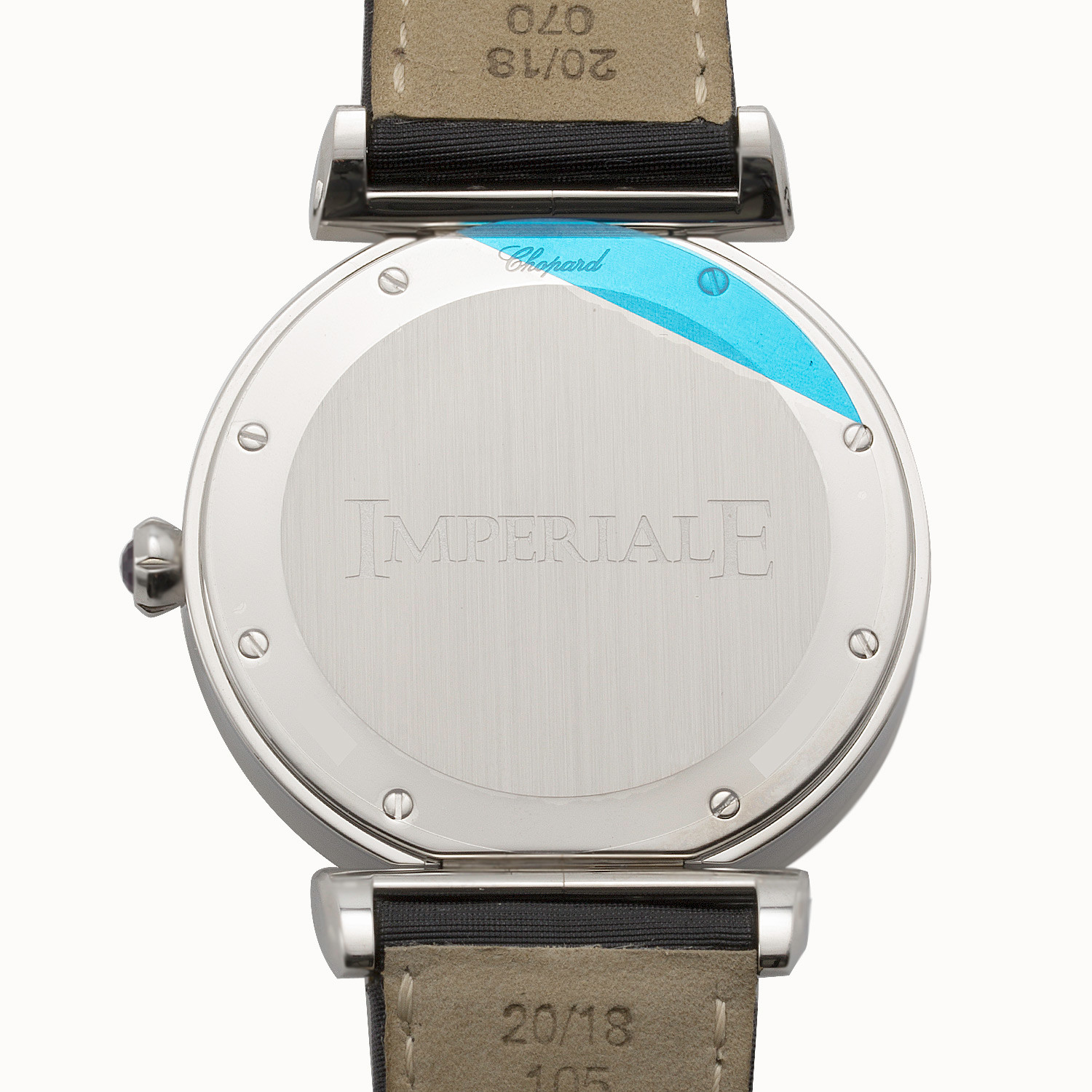 This handsome Chopard Imperiale 40mm stainless steel and amethyst automatic watch for men is in brand-new, unworn condition. As the Imperiale name suggests, this classic timepiece boasts regal stylings such as bold Roman numerals, finely curved hands, and an amethyst cabochon (.15 carat) inset in the pull-out crown. Features a mechanical movement with automatic winding, base caliber SW300, 28,800 vph, 25 jewels, and 42-hour power reserve.