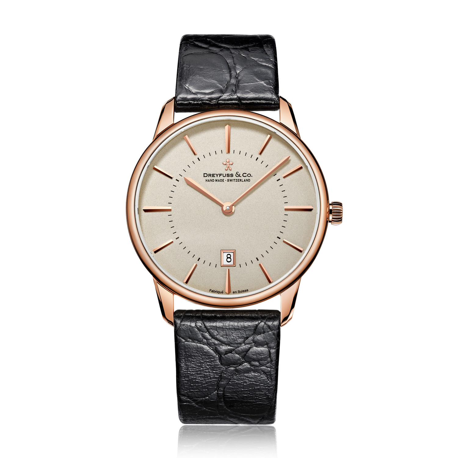 This Dreyfuss 1980 features a rose gold plated case with a Ronda quartz movement and sapphire glass. It's finished with a champagne dial with rose gold indexes and a date window.