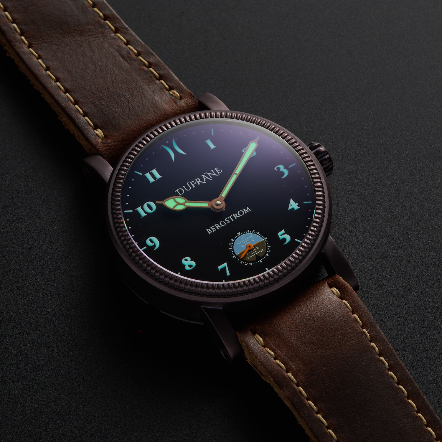 This Bergstrom is one of only 300 ever made, and boasts a matte-finish bronze case, along with a special horizon subdial that shows you where you are in relation to the horizon as well as counting the seconds - ideal for pilots. Your Bergstrom will also be delivered with a leather watch wallet, a warranty card, a polishing cloth, and two screw bar tools.