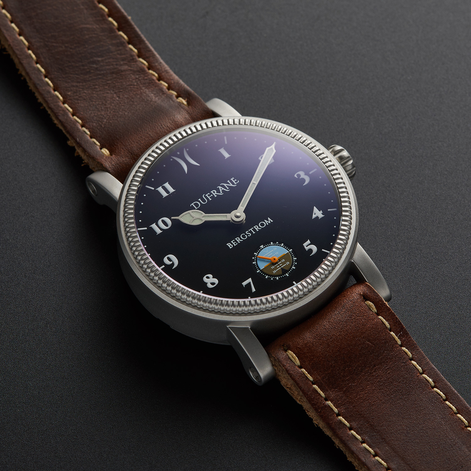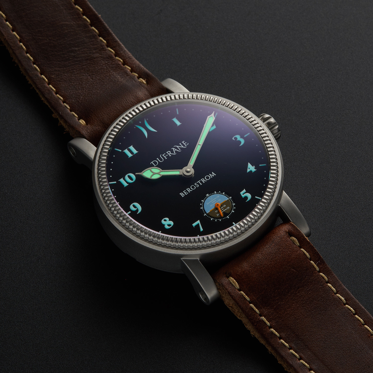 Every DuFrane watch is uniquely named after landmarks or historical figures associated with Austin, Texas, where they are based. The Bergstom is named after John August Earl Bergstrom, an Austin native and a US Army Captain who was stationed at Clark Field in the Philippines during WWII. Captain Bergstrom was killed by the simultaneous bombings of Pearl Harbor and other military areas in the Philippines in December 1941, becoming the first Austinite to be killed during the war. Captain Bergstrom was posthumously awarded a Purple Heart in February, 1943, and the Bergstrom International Airport in Austin is named for him.