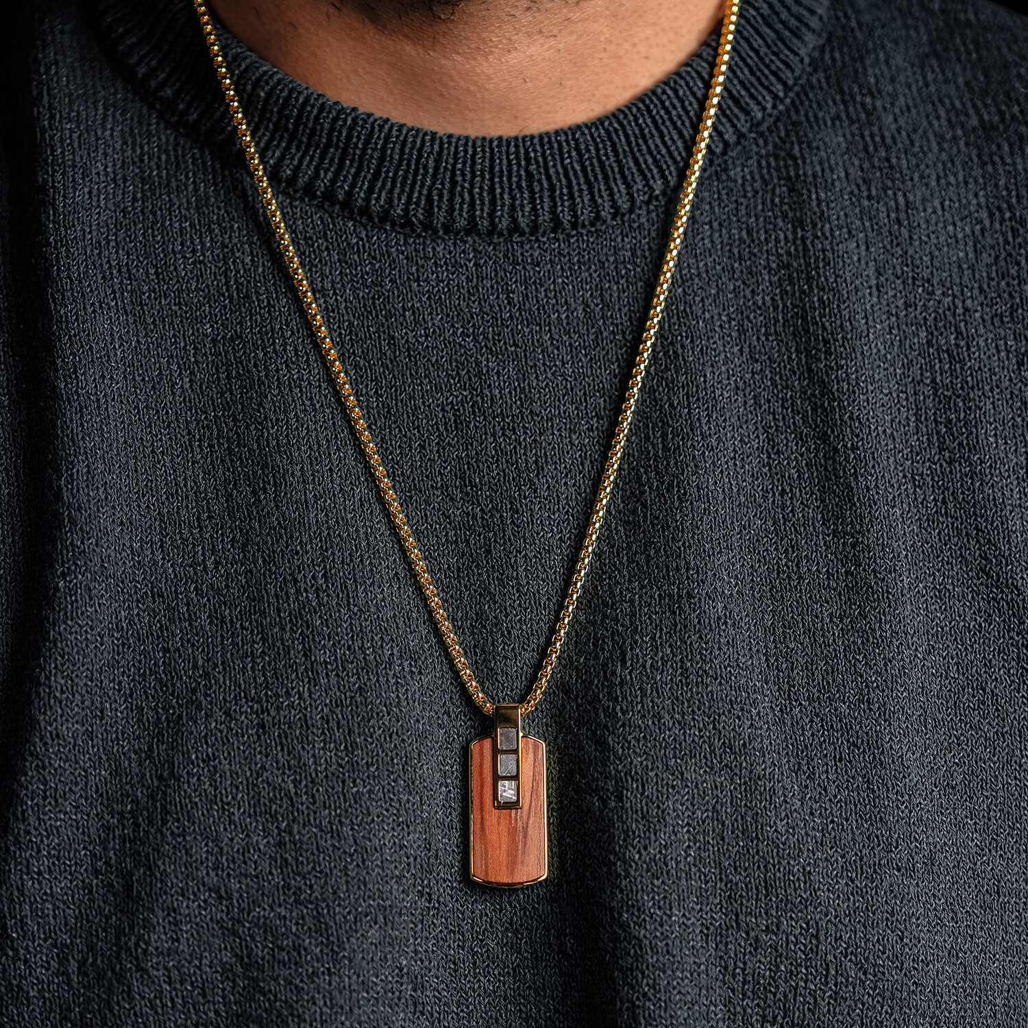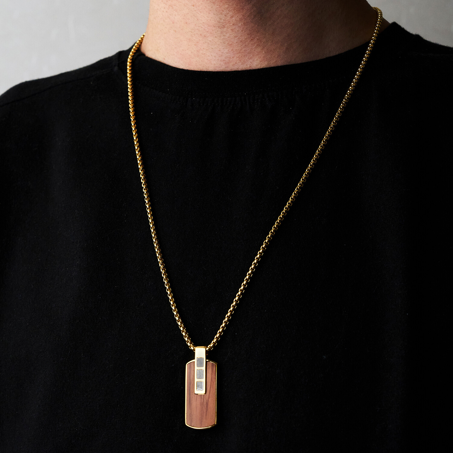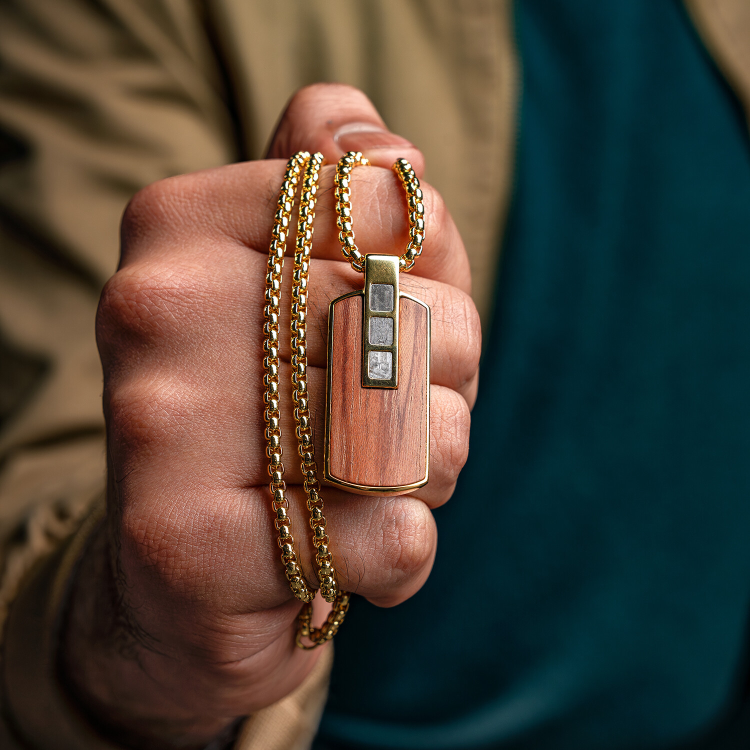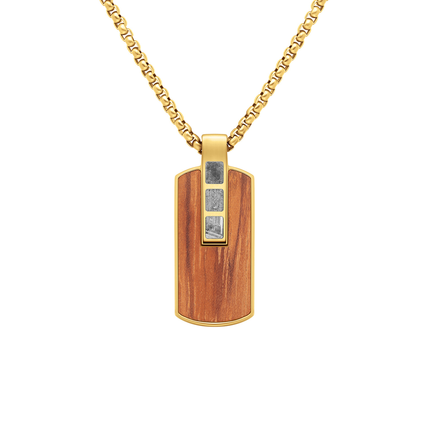 Duxot Accelero IP Gold-Plated Stainless Steel + Bubinga Wood + Meteorite Dog Tag Necklace // 25.6"