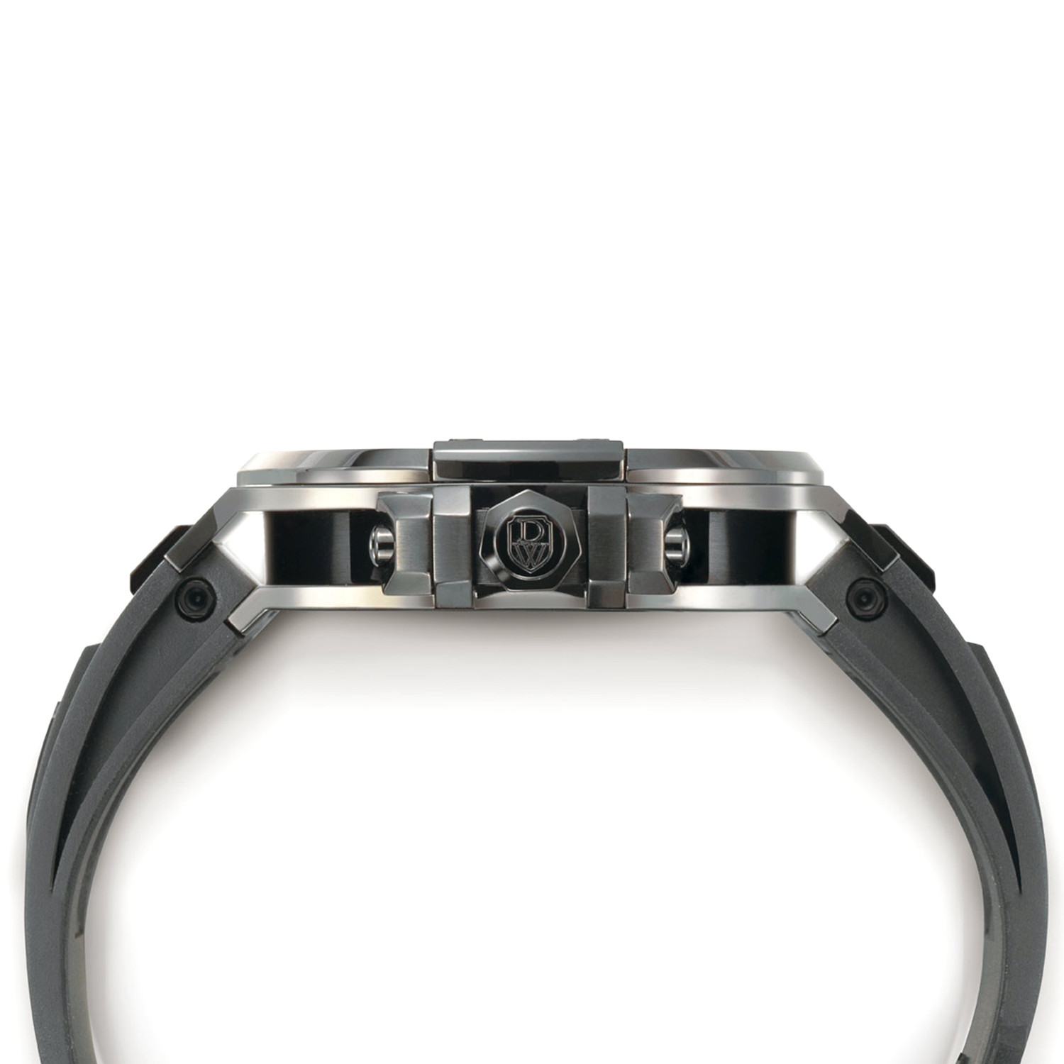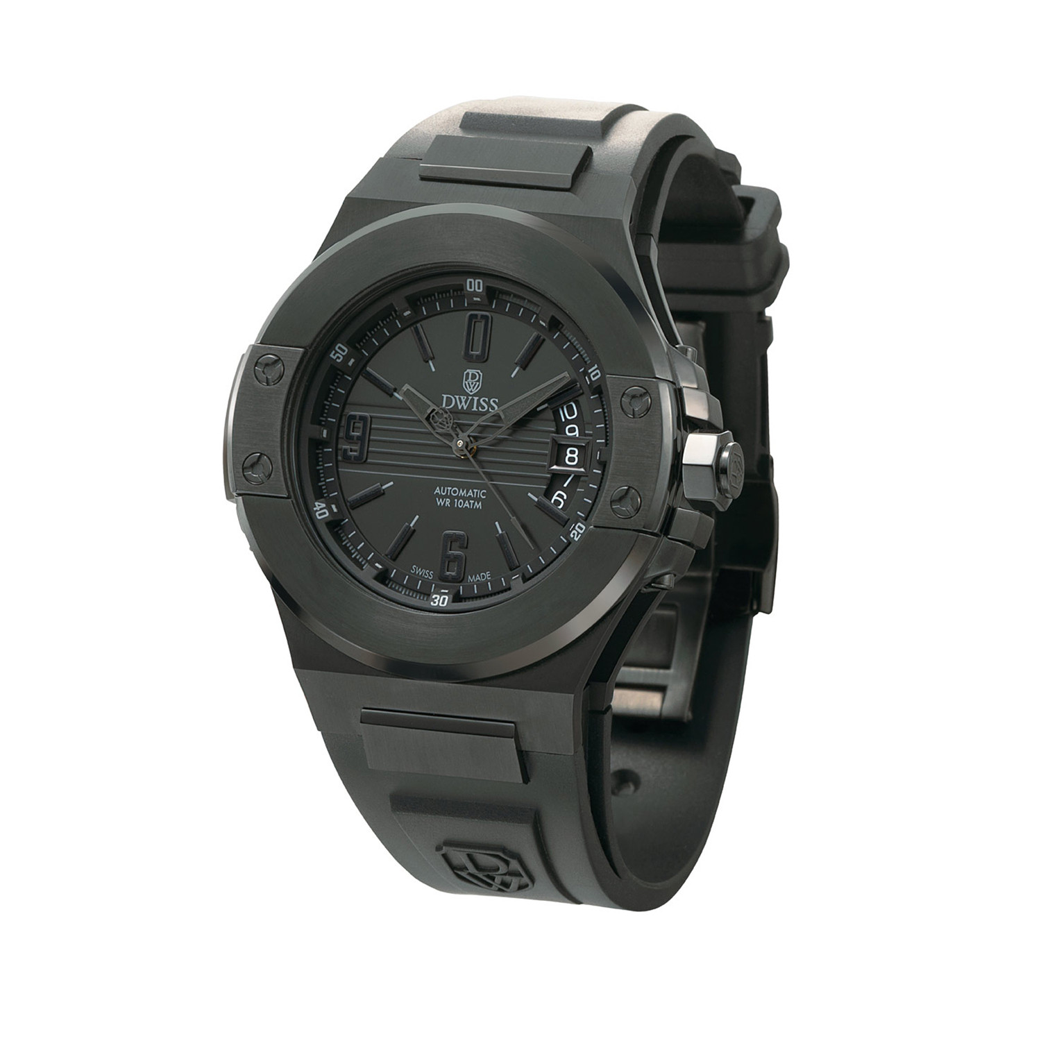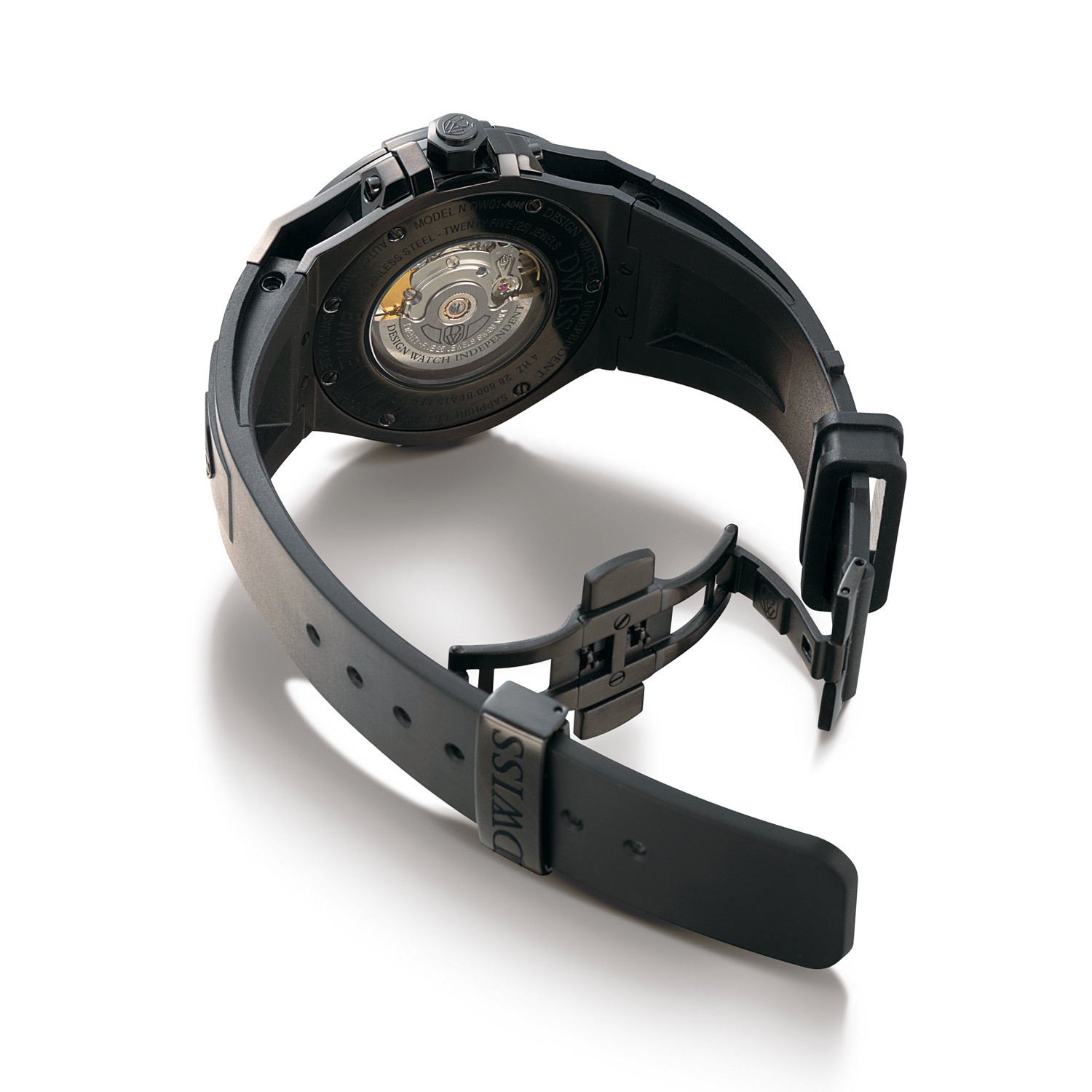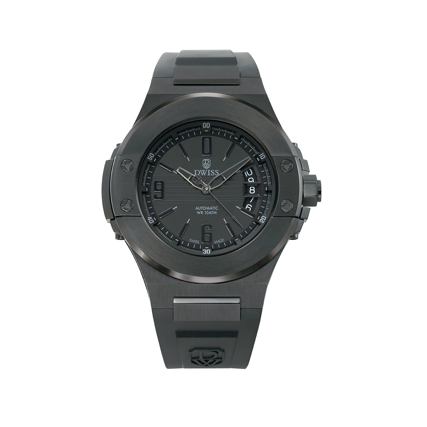 Emme is the first model of Dwiss’ brand for the international market. Swiss made, with a 43 mm diameter stainless steel case, and a finishing composed of 9 parts fixed through 23 screws with an exclusive patented multilayer case design construction. It uses a mechanical automatic Swiss made movement with 28,800 beats per hour, 25 jewels power reserve approximately 42 hours. Water resistant to 10 ATM (100 meters), the All Black is one of a limited edition of 150 pieces.