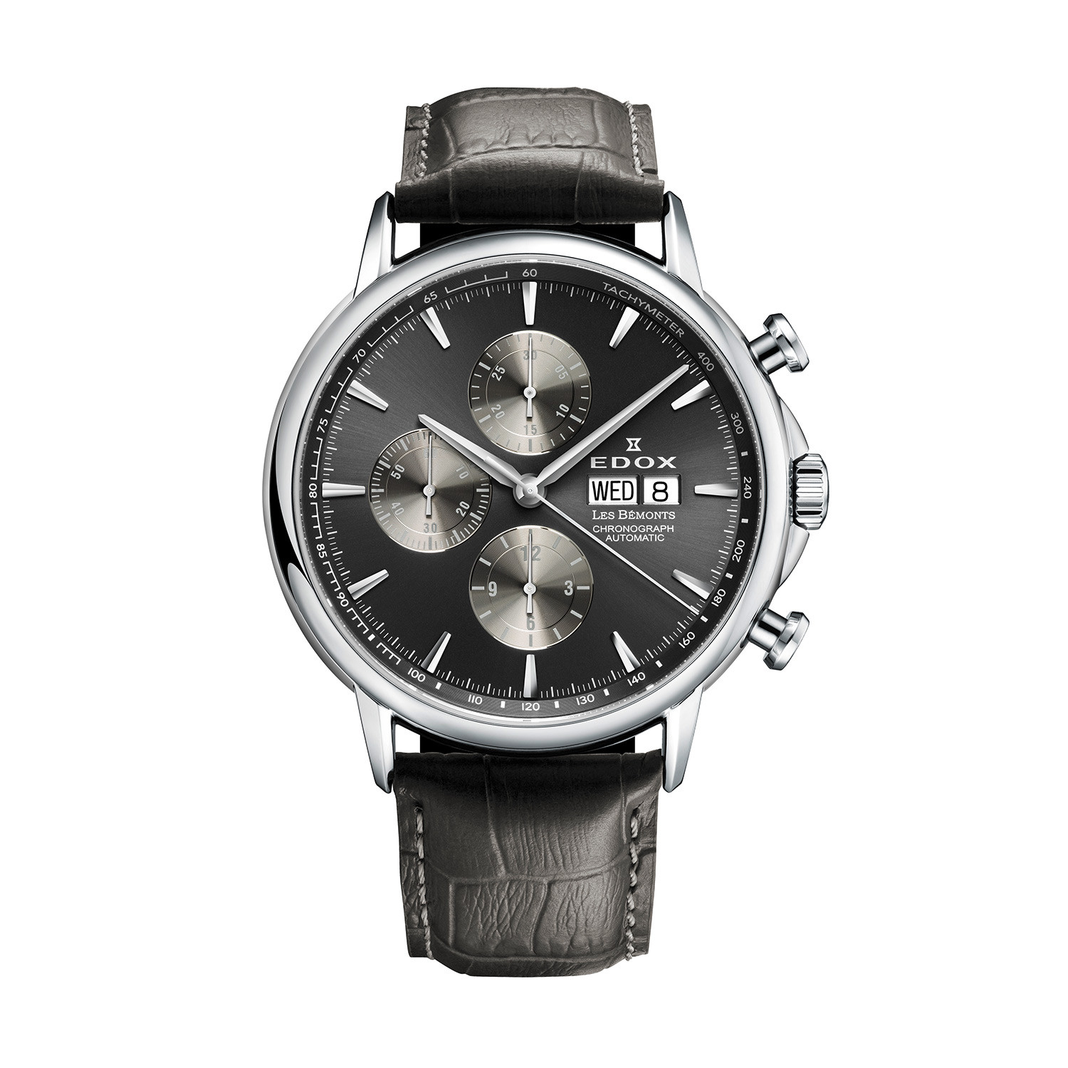 Les Bemonts is Edox's sophisticated dress watch. This one still has a bit of sport with its chronograph movement and tachymeter scale but a dressier look with its subtly tapered markers against its sunburst dial, classic pushers, and an elegantly curved case.
