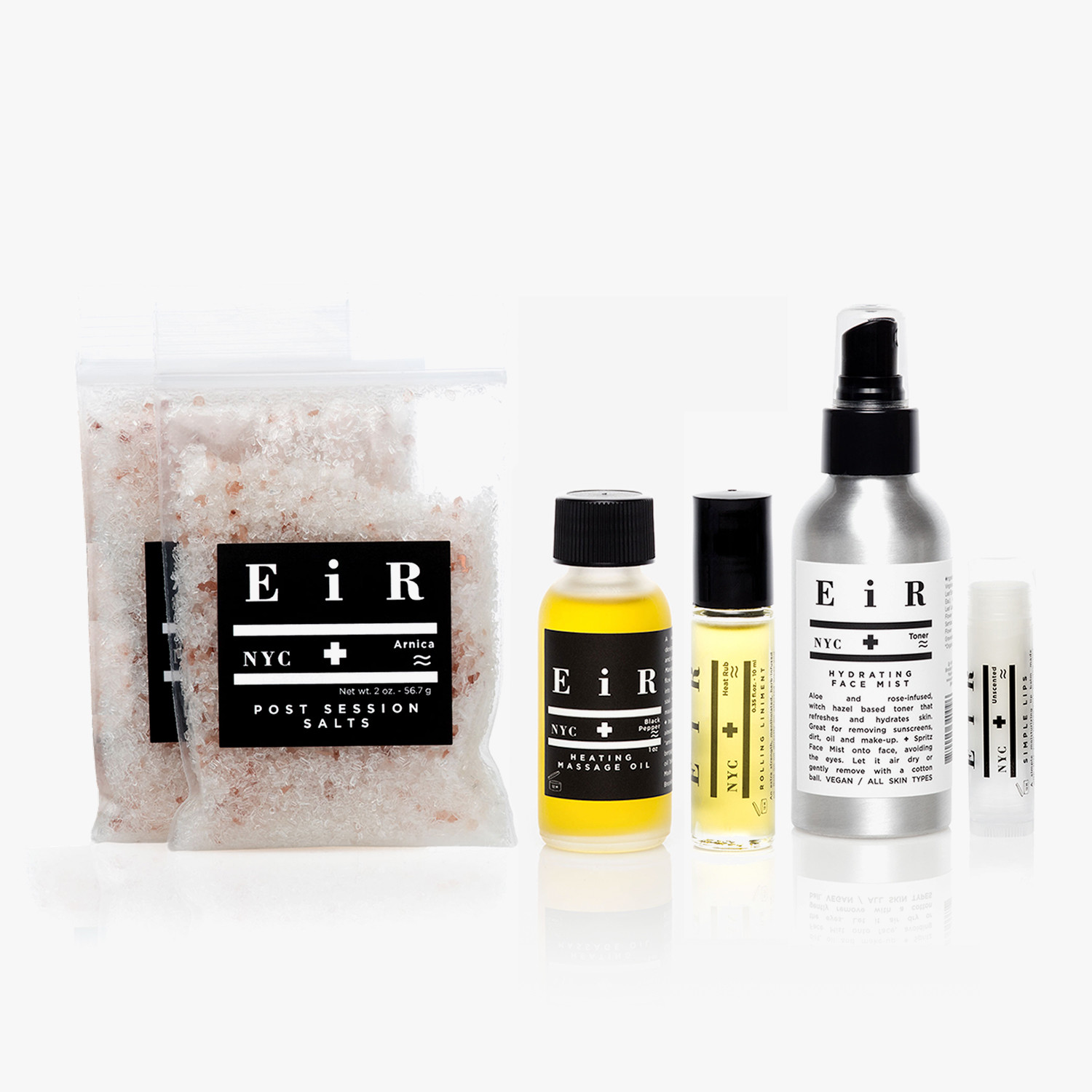 For those new to Eir NYC, the Mini Sampler Kit offers a sampling of must-haves. The Hydrating Face Mist is super nourishing and balancing. The Heating Massage Oil provides a wonderful warming feeling to enhance your massage, while also acting a deeply hydrating body moisturizer. The Post Session Salts provides a super relaxing and rejuvenating, full body soak, and the Rolling Liniment is a powerhouse reliever of pulled or strained muscles. Finally, Simple Lips is the perfect tool to protect your lips day after day. All Eir NYC products are 100% natural and chemical free so you can be as kind to the environment as you are to your skin.