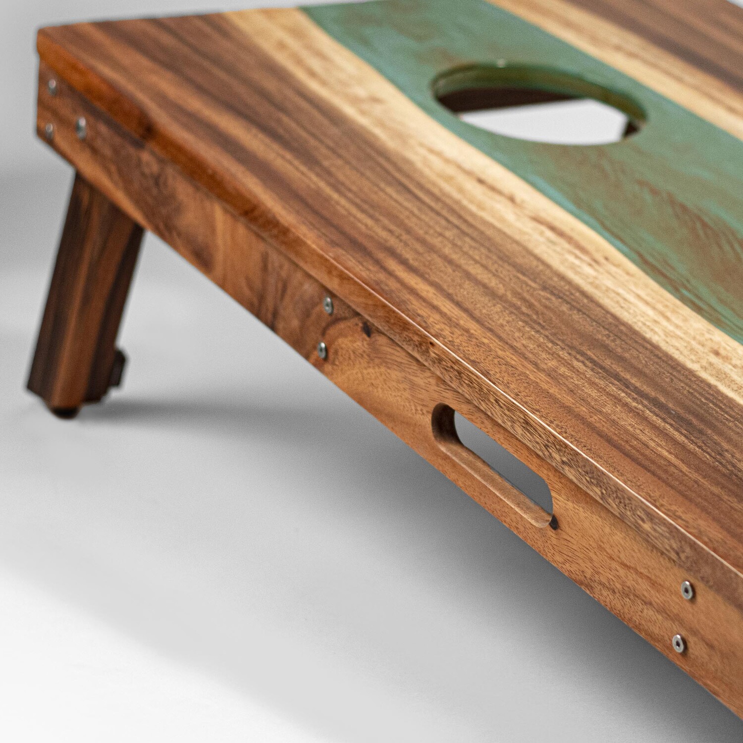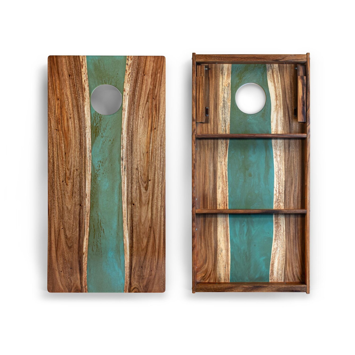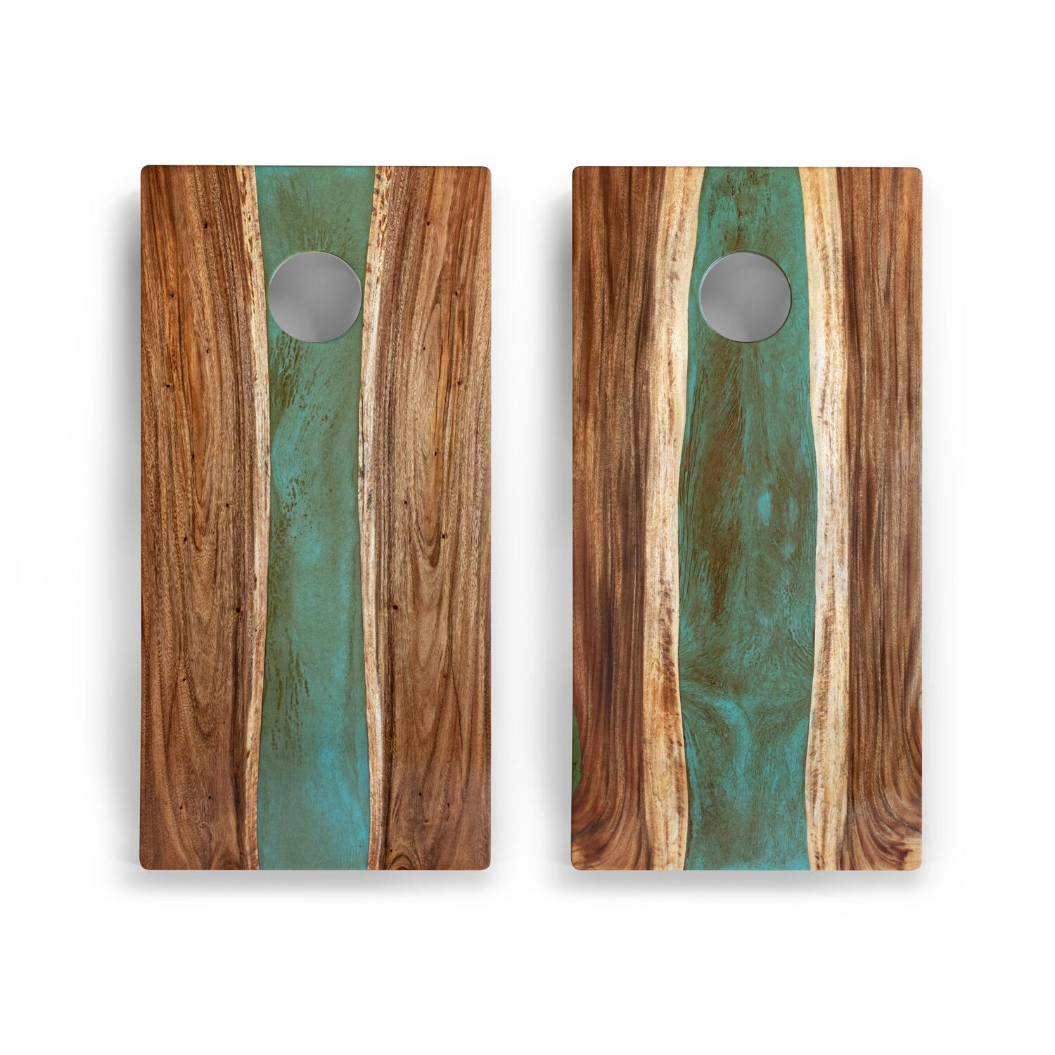 Handmade from live-edge solid wood and epoxy resin, this heirloom-quality, two-by-four-foot regulation cornhole board set serves as a centerpiece of fun and unforgettable artistry for your home. Each board is intrinsically one of a kind with its own distinctive wood grains and a uniquely-shaped epoxy resin river down the center. Whether displayed as art or being used in the yard to play cornhole with your friends, this premium board adds to the wow factor of your backyard.
