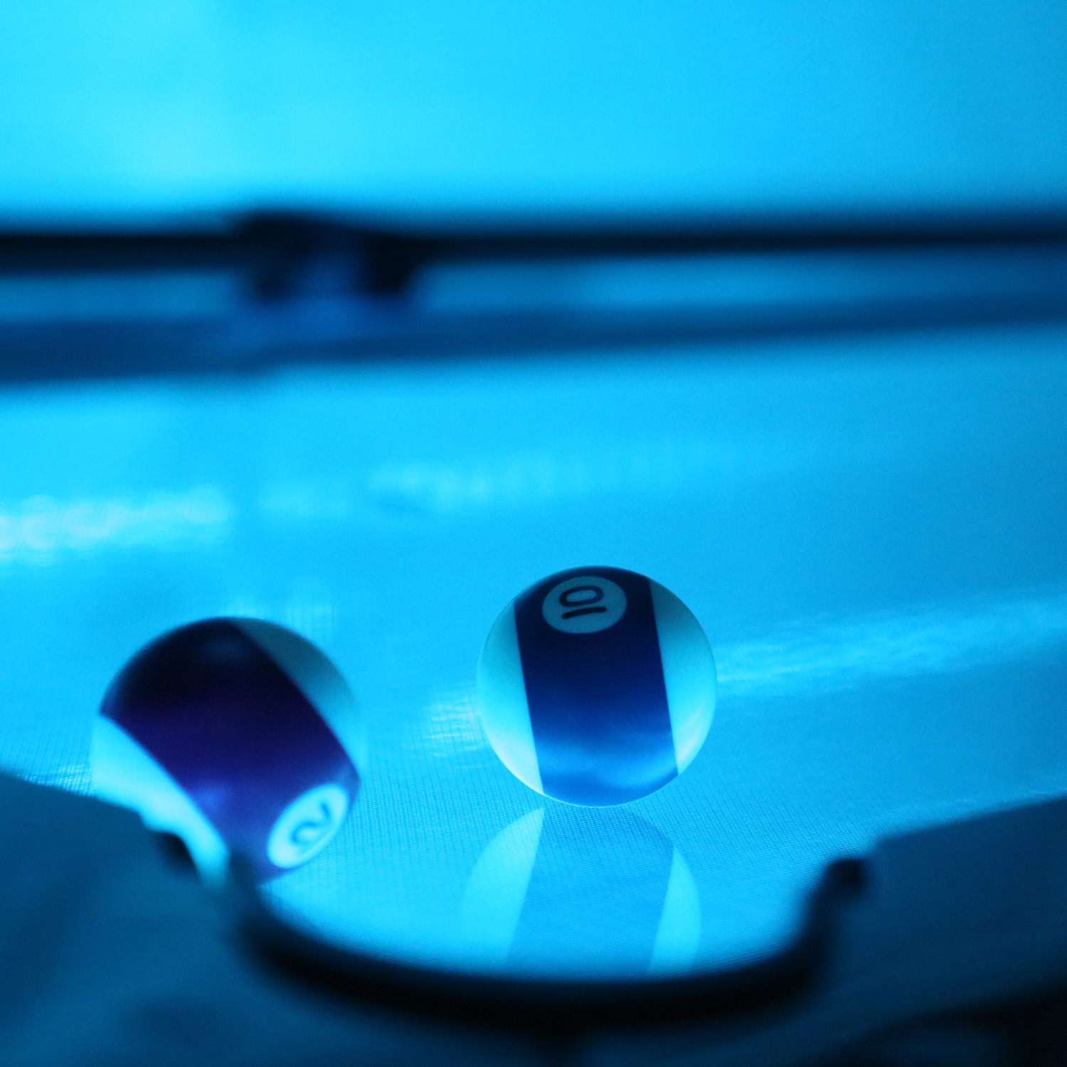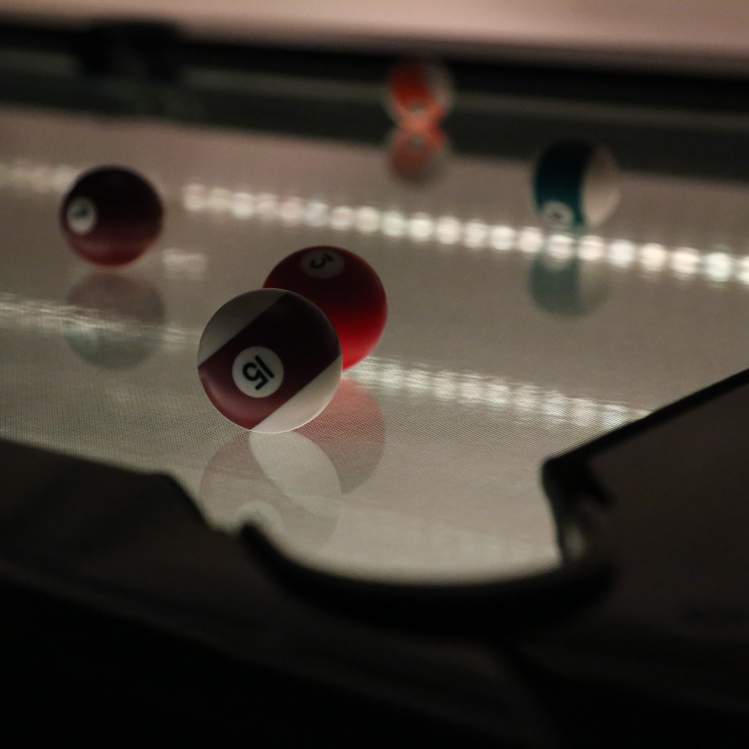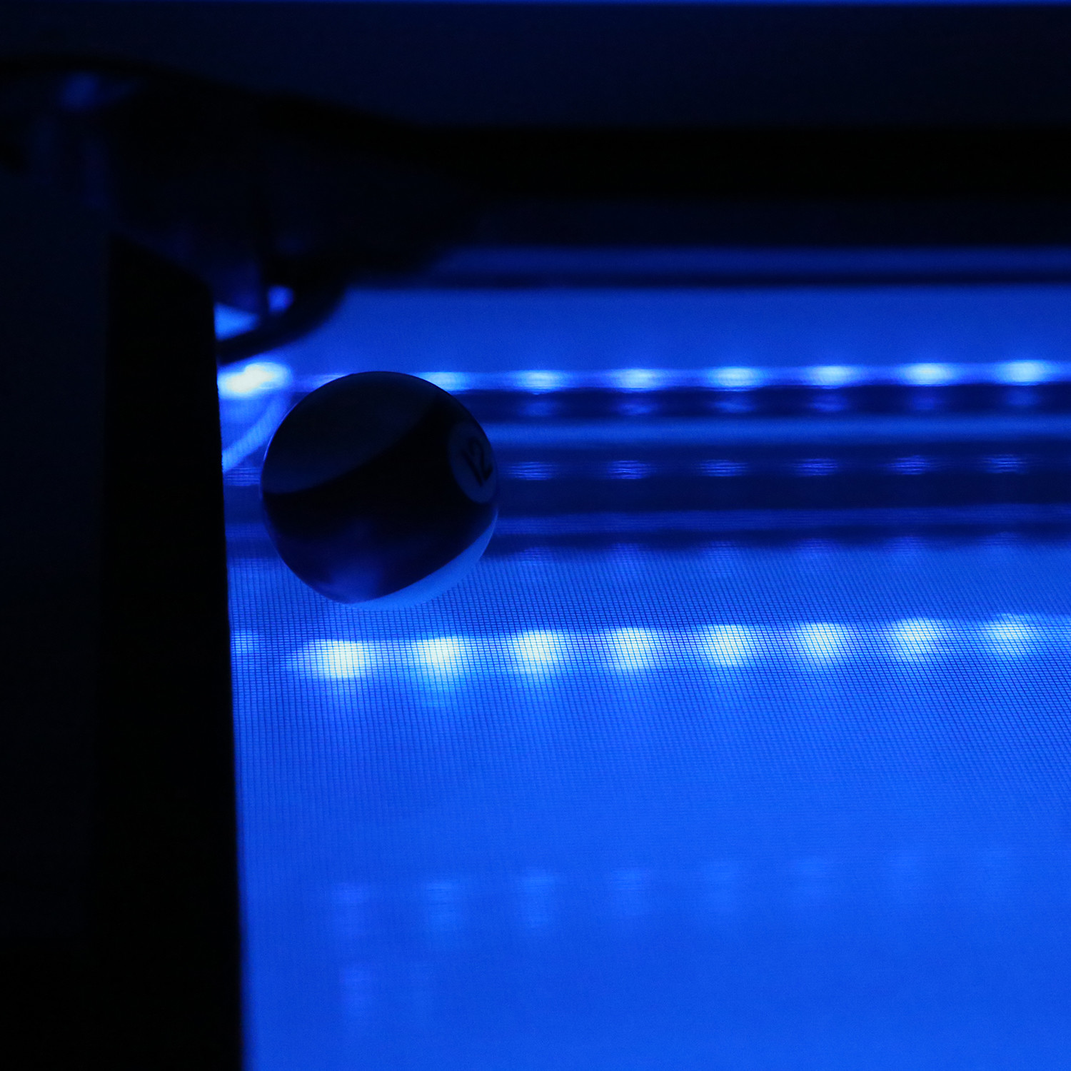 The transparent playing area is topped with a patented Vitrik surface. This surface material replicates the rolling resistance of real felt and provides a shock-absorbing layer for the glass beneath. It is a smooth, glossy, see-through material with a fine mesh inside, so the table retains consistent roll characteristics over its lifetime. The glass itself is a 15mm Monolithic Float glass piece with exposed polished edges. Glass is naturally very rigid and flat and isn’t susceptible to sagging or warping so provides a great alternative to slate for a pool table.