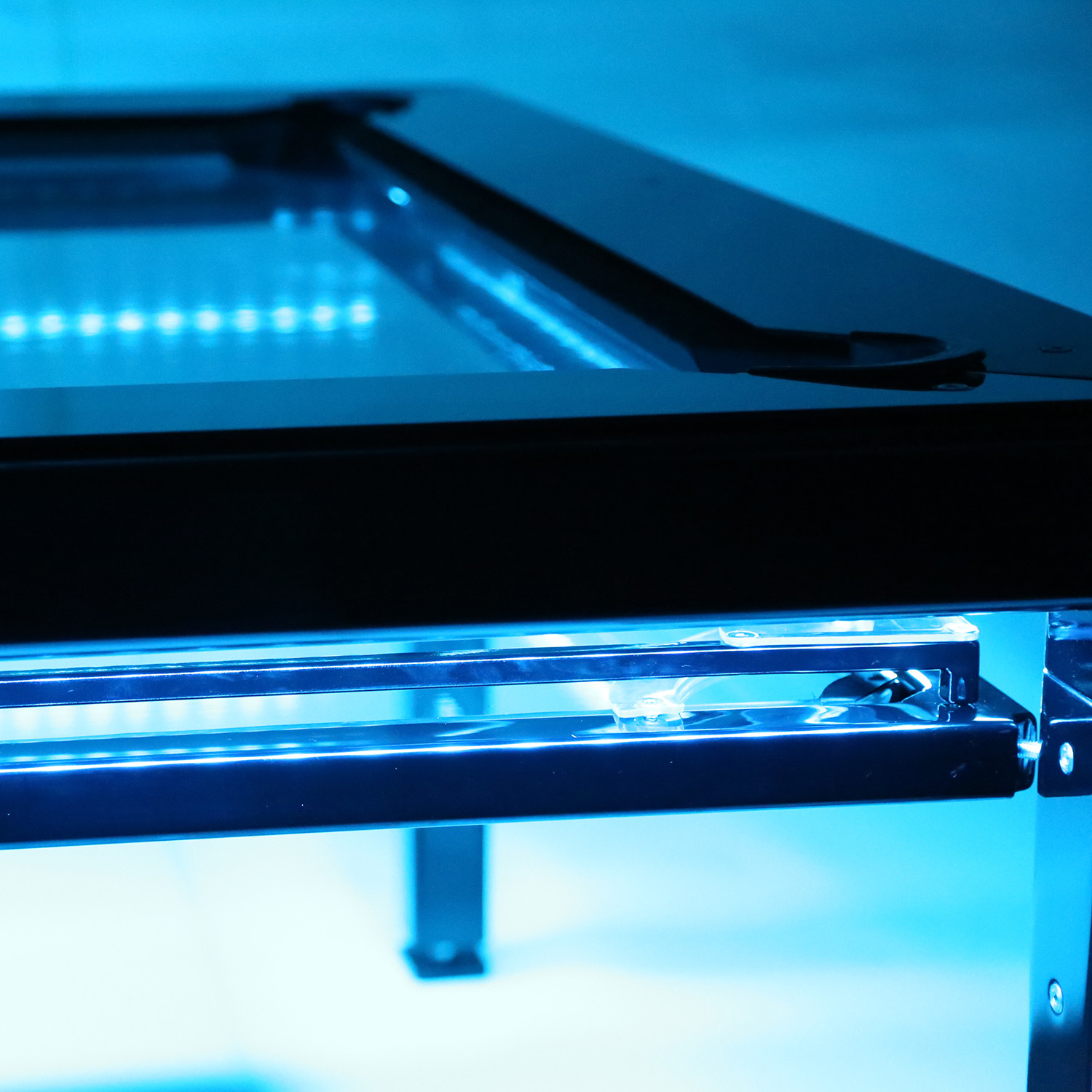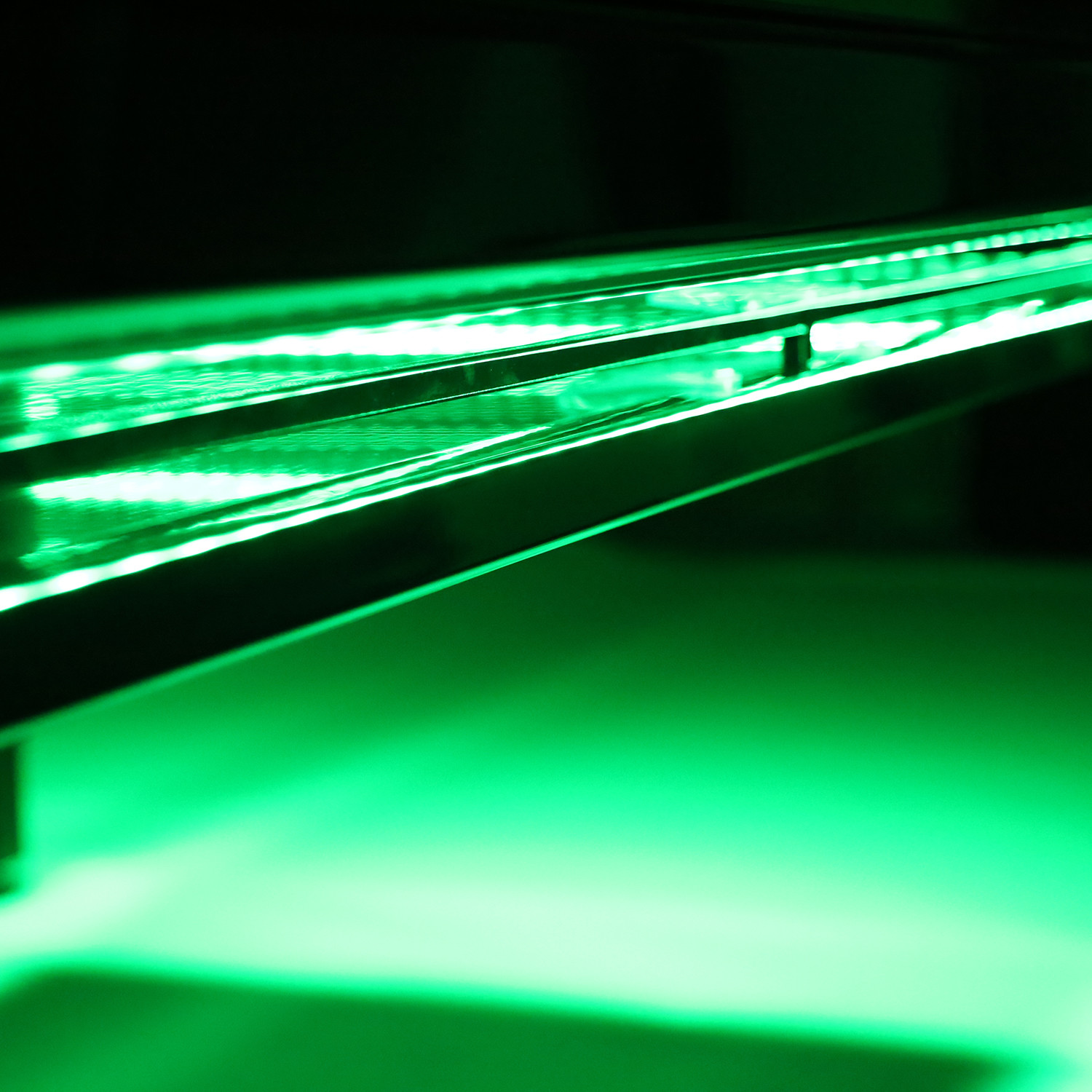 The frame is made of sleek, matte-finish structural steel, and the table comes with an option for integrated LED illumination. With this feature, the table comes with a wifi remote that lets you control the colors of the LEDs at will. There are 26,000 possible colors to choose from, and the pre-set programs let you easily cycle through colors and change the timing of the sequence.