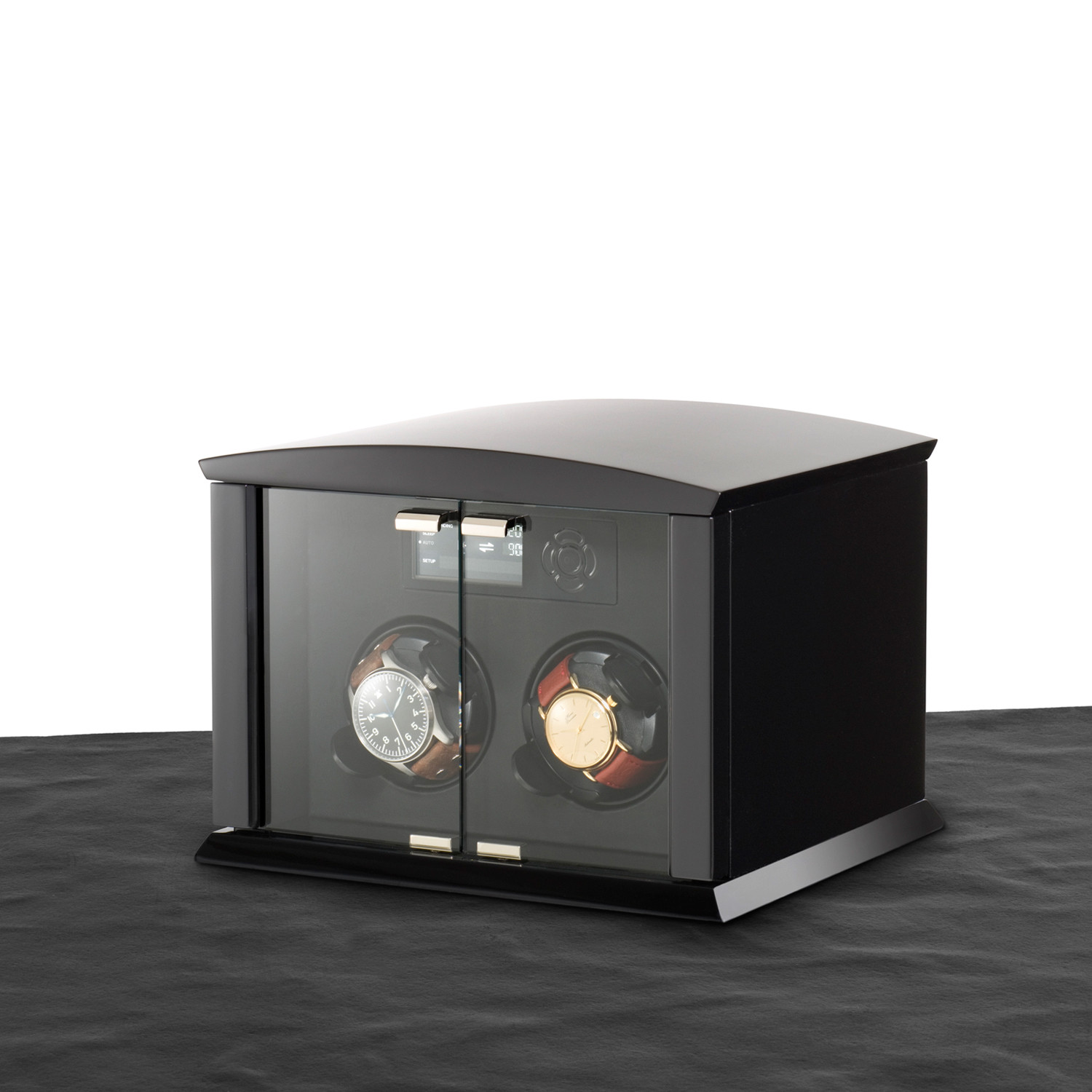 The Elmamotion Corona 2 for two watches features glass and real walnut wood inlays, combining exclusive interior design with the latest technology. The selected woods are sanded by hand at least ten times and are coated with lacquer to receive their elegant shine. The operating elements of the electronic functions are discreetly integrated into the front, offering all the function you need for your wind-able watch collection.