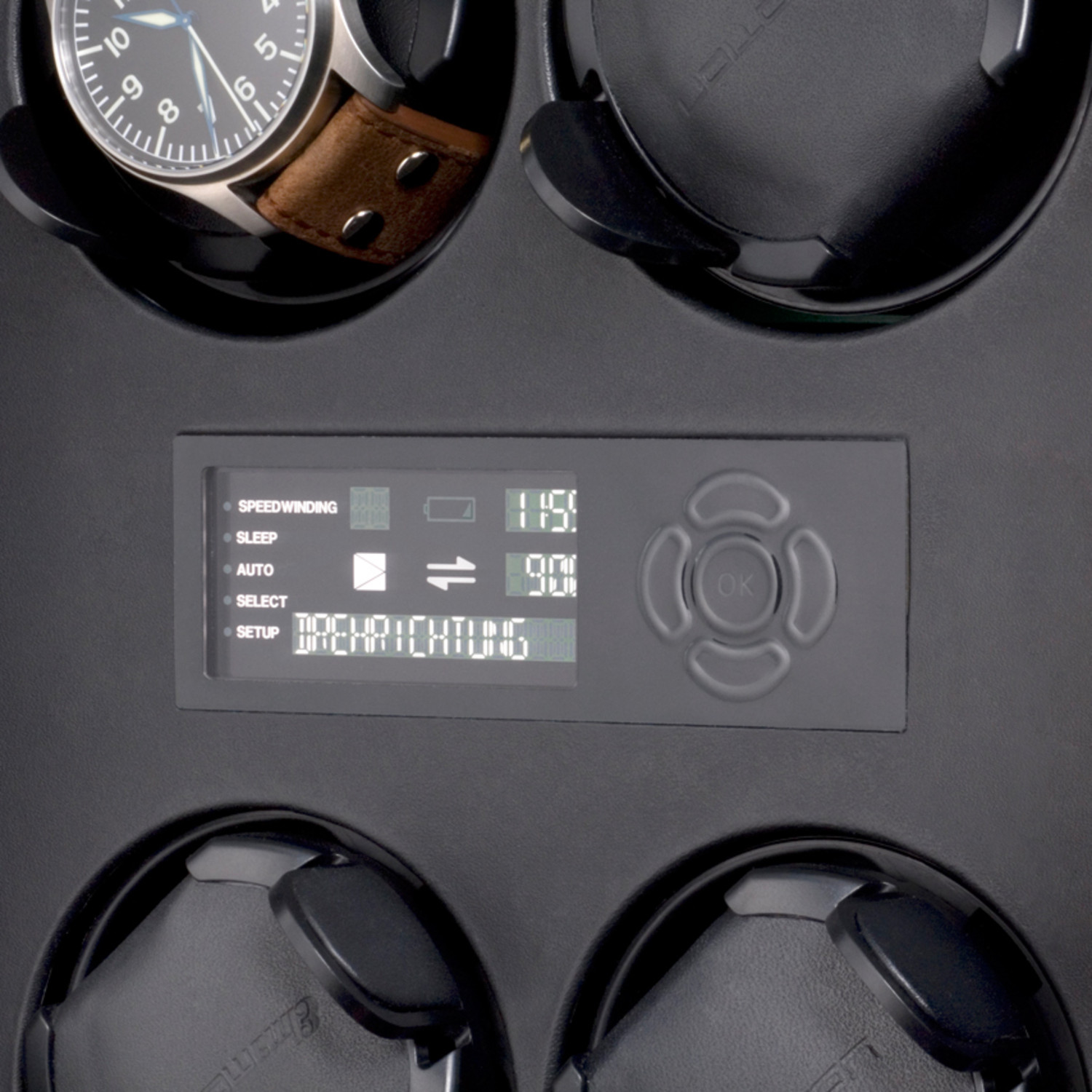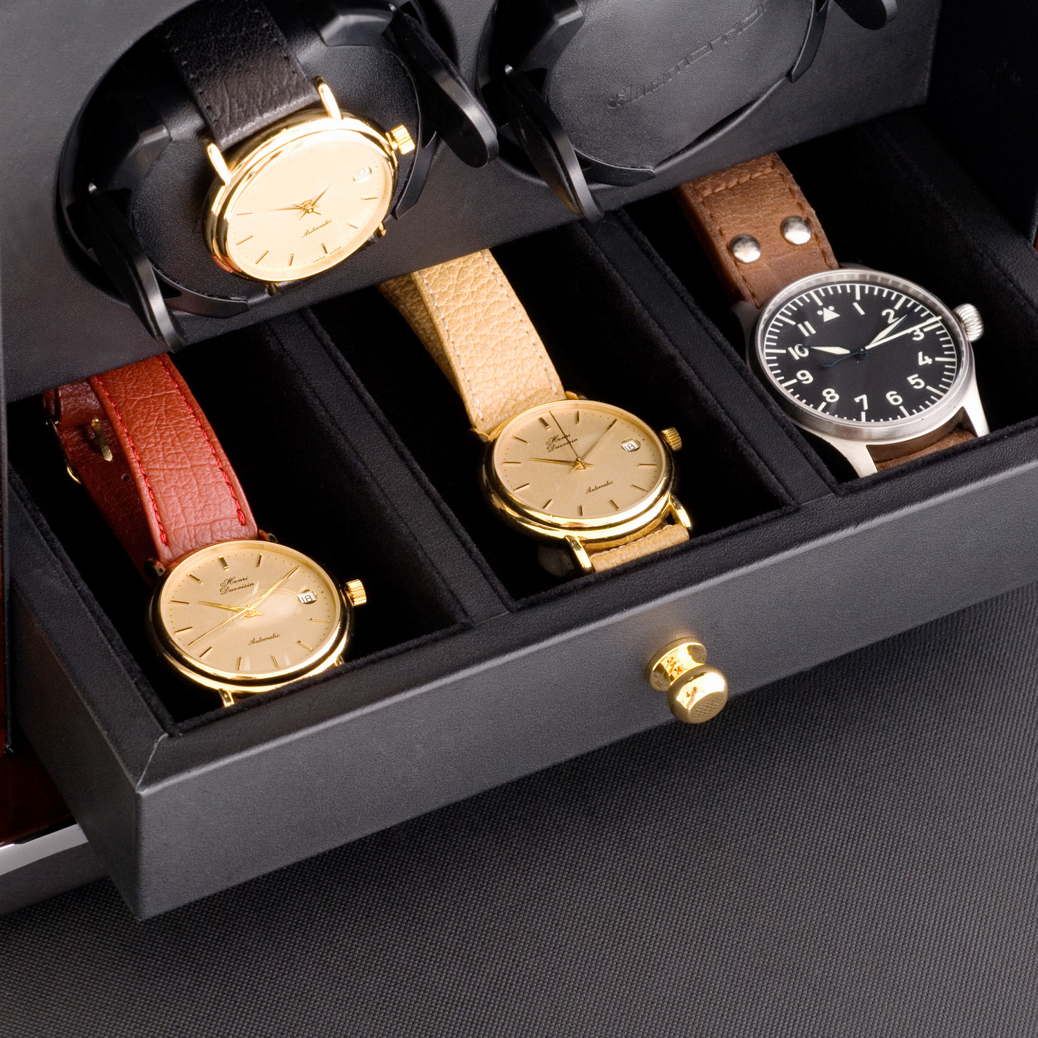 The Elmamotion Corona 8 for eight watches features glass and real walnut wood inlays, combining exclusive interior design with the latest technology. The selected woods are sanded by hand at least ten times and are coated with lacquer to receive their elegant shine. The operating elements of the electronic functions are discreetly integrated into the front, offering all the function you need for your wind-able watch collection.