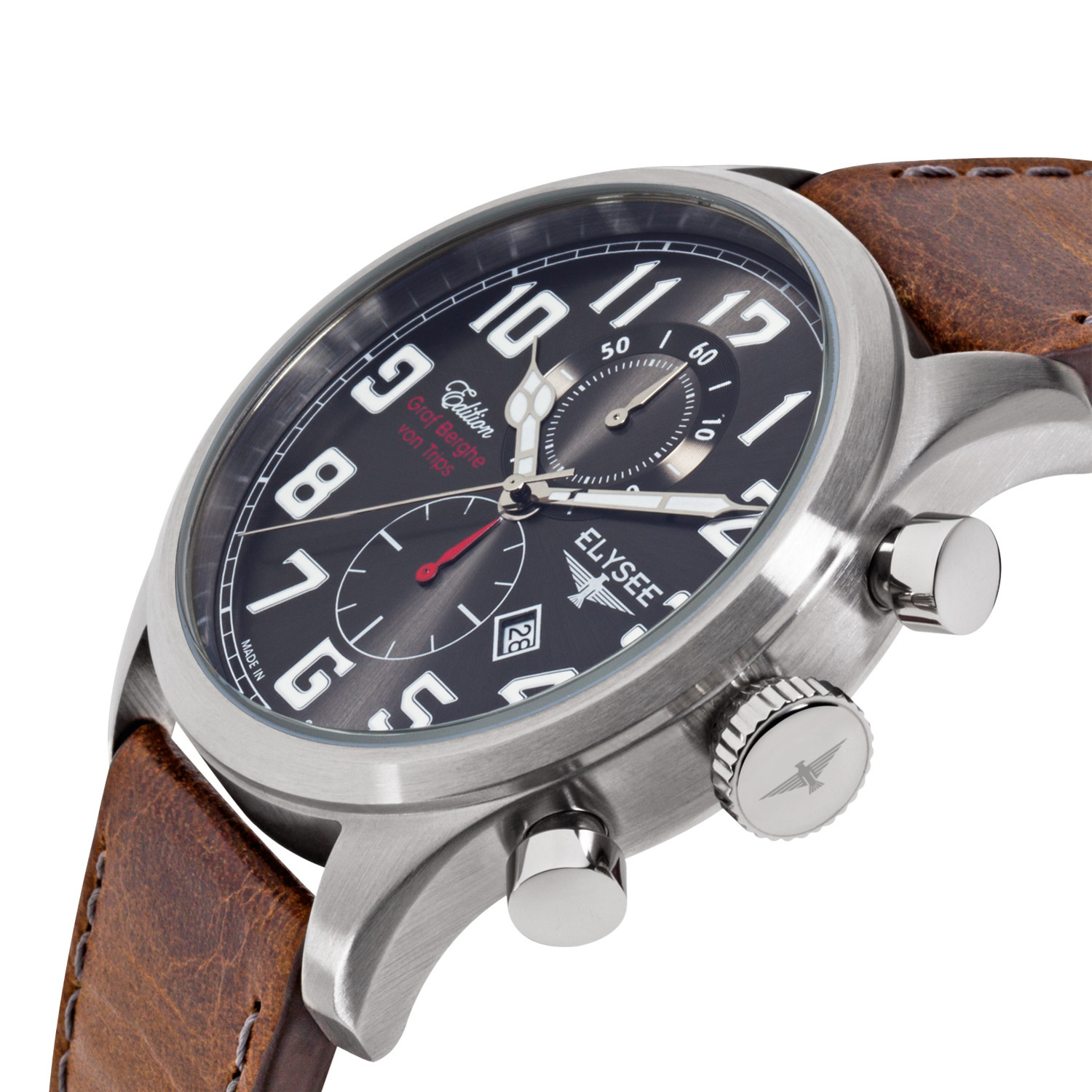 The name Kerpen from the Graf Berghe von Trips edition is the namesake for this high quality chronograph from the ELYSEE stable, as well as being the birthplace of Graf Berghe von Trips. This model is a real head-turner, and not only for fans of the unique racing driver. A quality high-grade stainless steel case with a stunning crown encloses the accurate chronograph watch mechanism made by the Citizen/Miyota brand. As well as a date indicator, the watch also has a stop watch function. Thanks to the luminous numbers and indicators it is possible to read the time well in the dark too. This high quality watch is protected by scratch resistant, antireflective sapphire glass, and is water resistant to 10ATM. The signature Edition - Graf Berghe von Trips adorns the dial too. So as to emphasize the unique qualities of this watch, Elysee includes a fine vintage leather strap with a red lining.