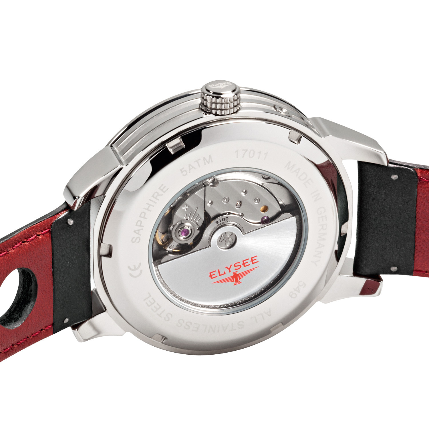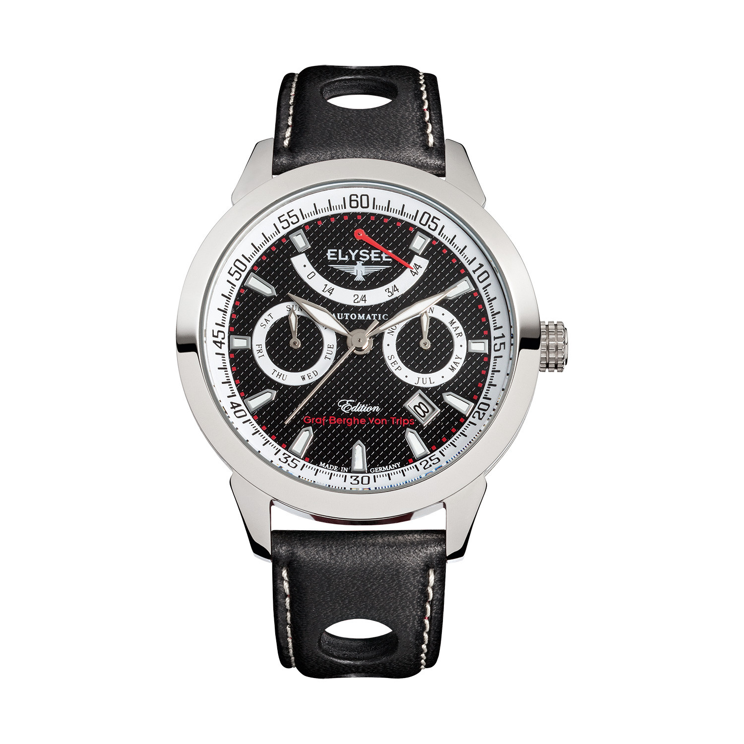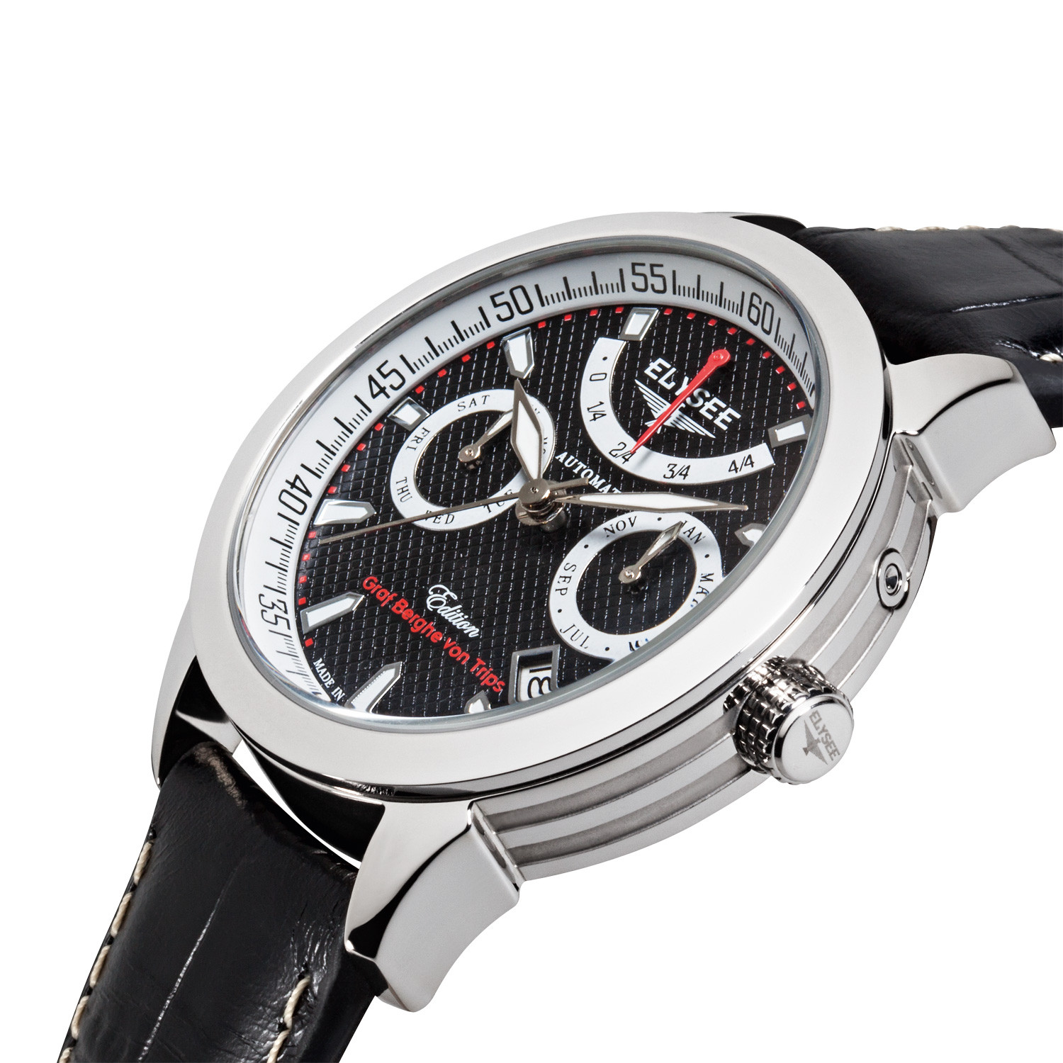 This sporting automatic Taffy I watch has convincing functionality. As well as day, date and month indicators a power reserve indicator is provided. This shows how much power remains in the rotor. The sporting style of this automatic watch is further underlined by the signature edition "Graf Berghe von Trips" on the watch face. Of course the watch is provided with scratch resistant, antireflective sapphire glass. The high quality movement can be seen through the transparent caseback. The wrist strap, made of the finest leather and with a red lining, offers an optimal fit.