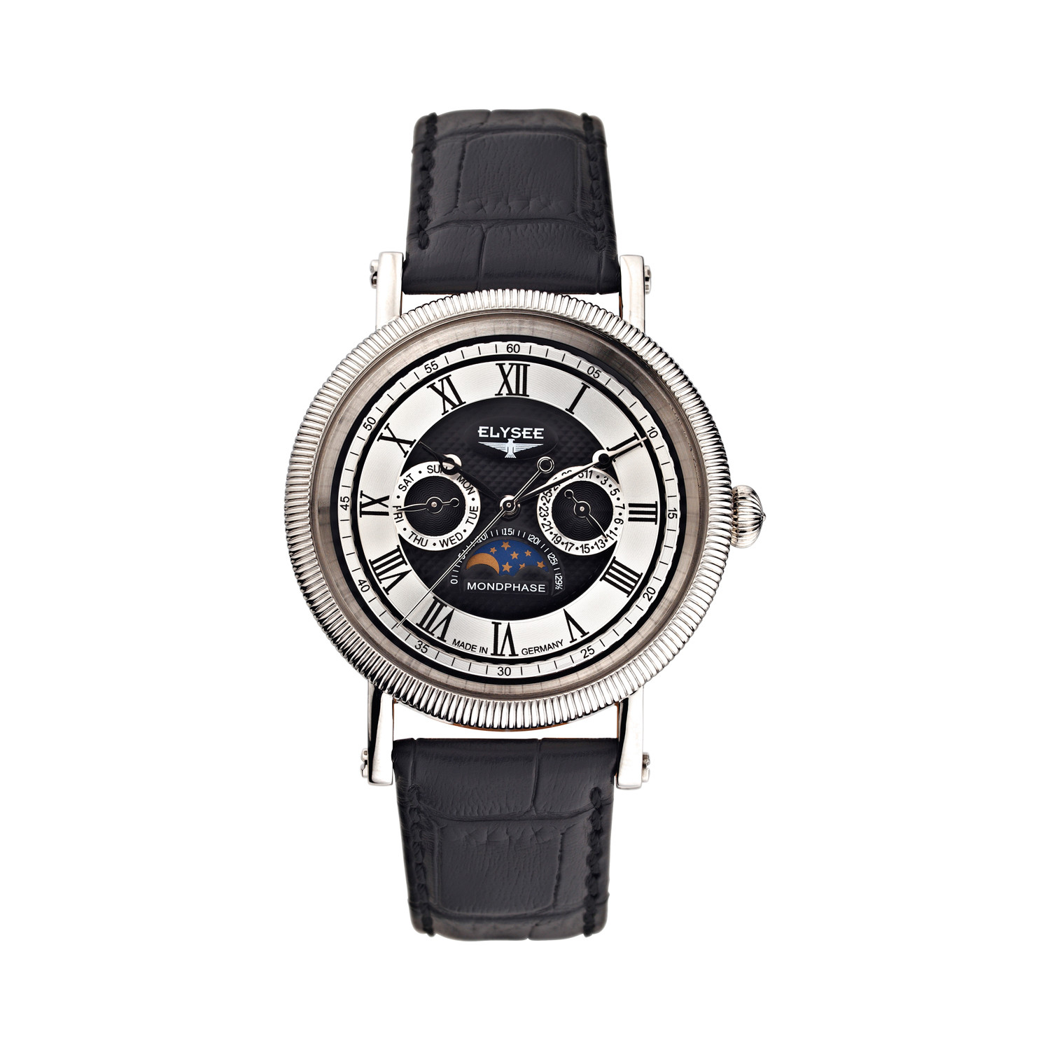 The elegant Agenor model from Elysee immediately catches the eye. Roman numerals as well as the beaded edge make this watch something really quite special. The Swiss multi-functional movement with day and date display also features a display for the lunar phases. The strap is made of the finest embossed leather and has been designed to meet the highest of requirements.
