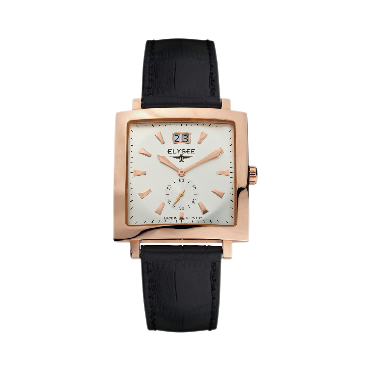 The Elysee Classic Series is being expanded to include the Herakles model. The square, polished stainless steel case is a perfect fit for the wearer’s arm. Elysee uses a Swiss movement with a large date display and decentral second hand for this watch. The sloping edges of the face are what make this model unique.