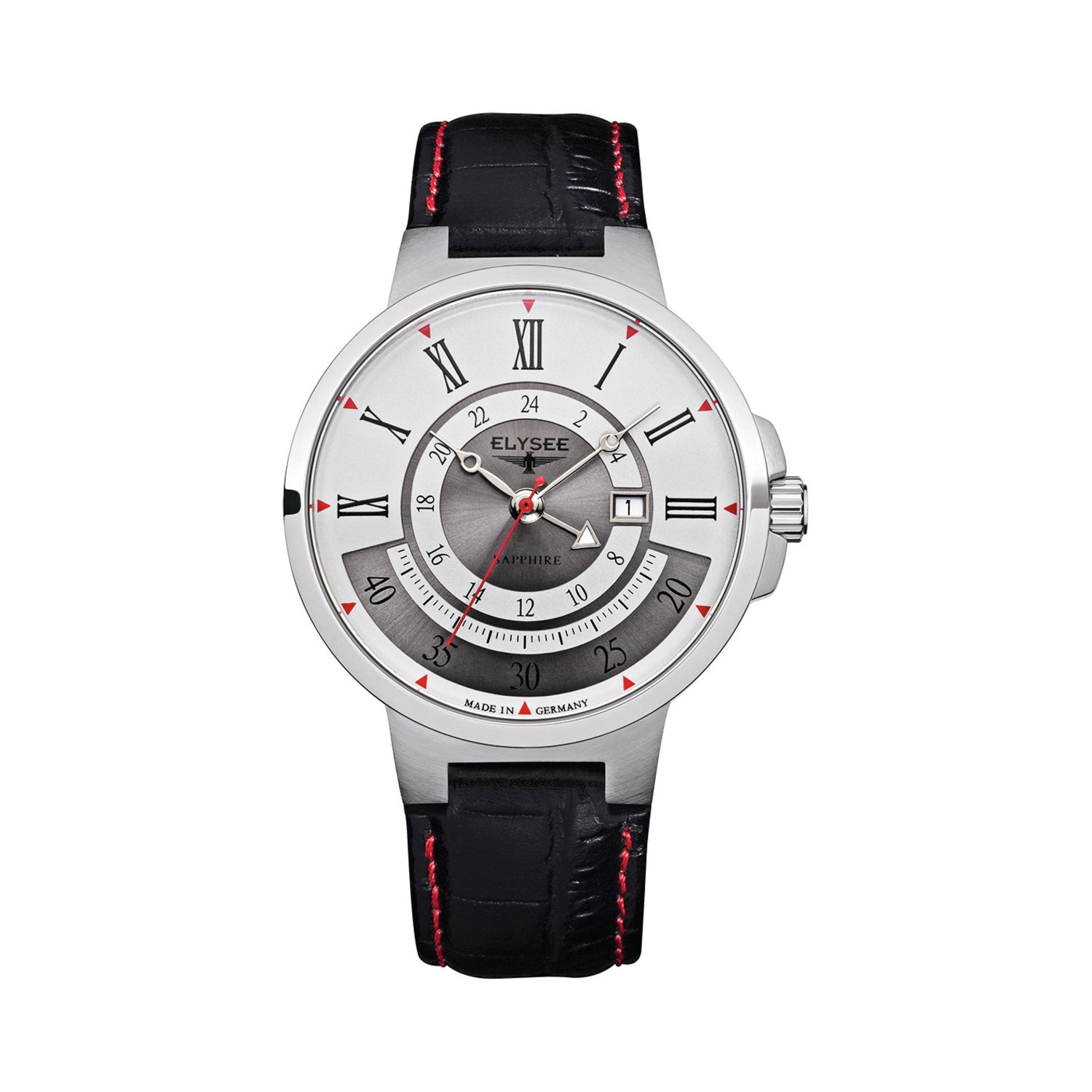 Marathon is the name of this magnificent Elysee model, which comes equipped with a Swiss GMT movement from the Ronda brand.This very elegant watch has a unique design using Roman numerals.The fourth, small indicator in the inner circle shows World time in the 24 hr mode. In the 3 o’clock position you can find the date indicator.The high quality case in high-grade stainless steel is attached to a fine, moulded leather strap.