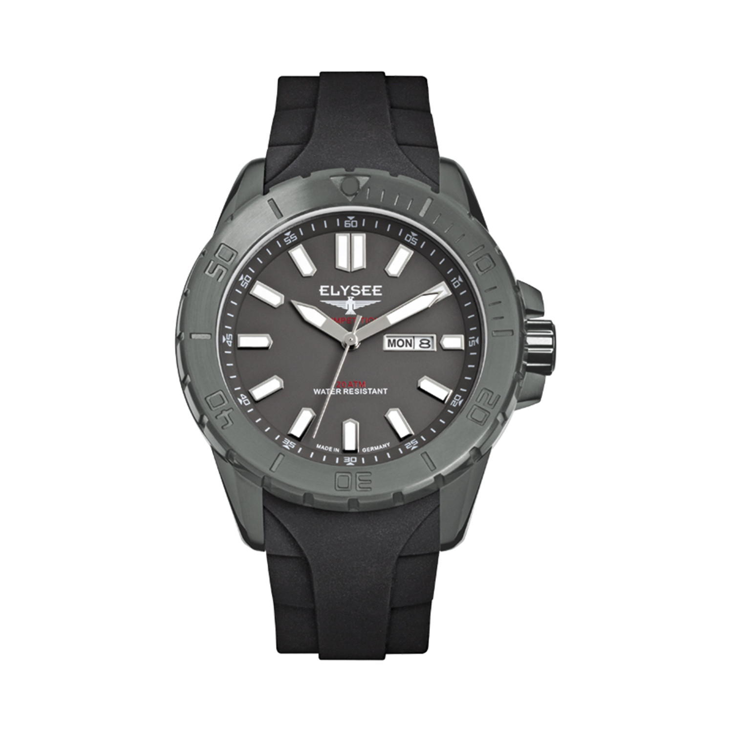 The Set-Up is something very special. It is the first automatic watch in the successful Elysee Competition Edition. The massive case is an eye-catcher, made of high quality stainless steel, with the crown bolted and waterproof to 20ATM. The movement is visible through a bolted bottom made of glass and comes with a day and date display. A coated and hardened mineral glass is on board, as well as a rotating bezel for diving.