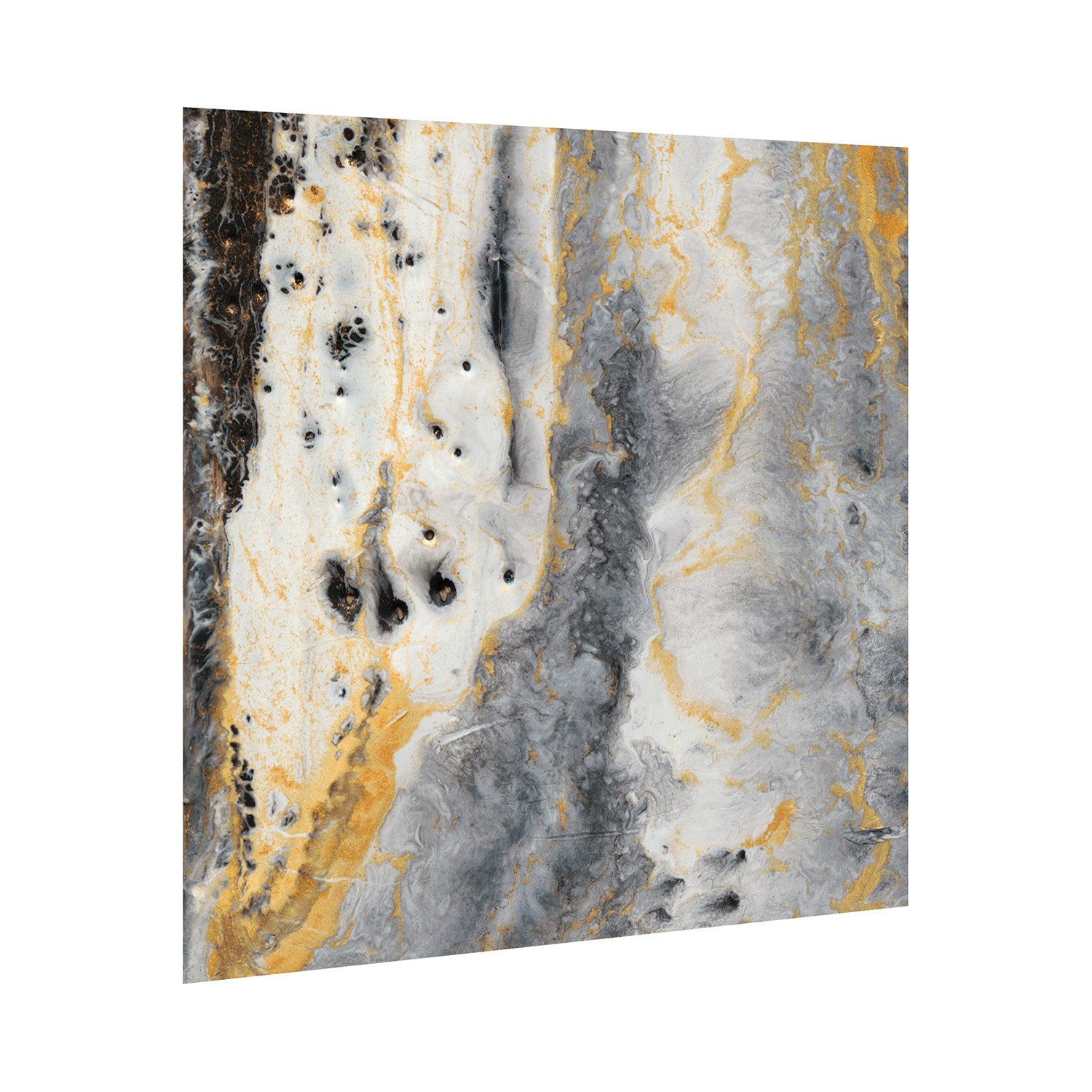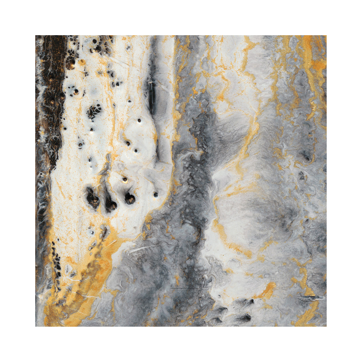 Streaming across a monochrome landscape, Bands of Gold successfully draws out the shining qualities of gold, accented by gold leaf. The flow of black and white on this image makes it feel like an aerial image of snowy mountains, with dark, earthen foothills. The long streams of gold are like the mountain’s peaks, capped by gold instead of snow, touched by divinity.