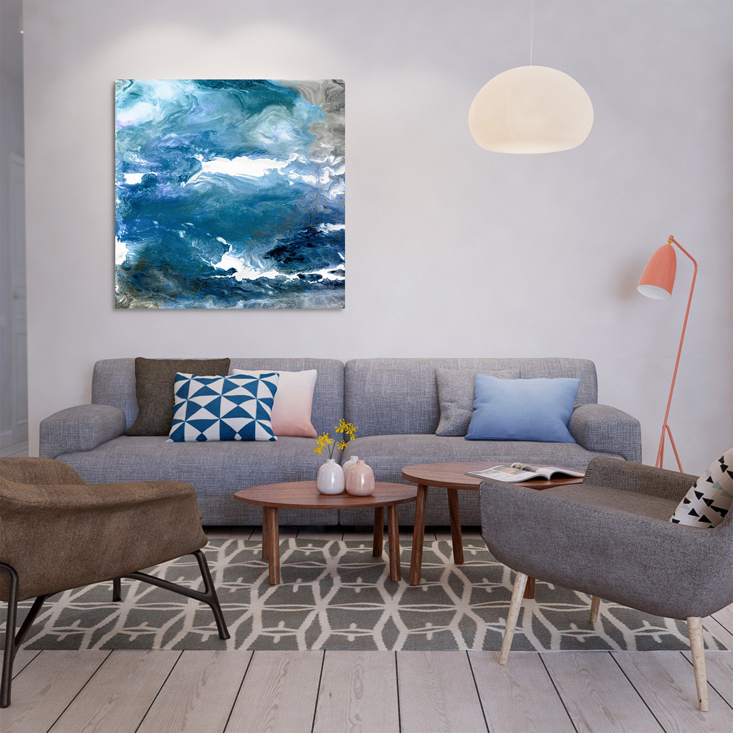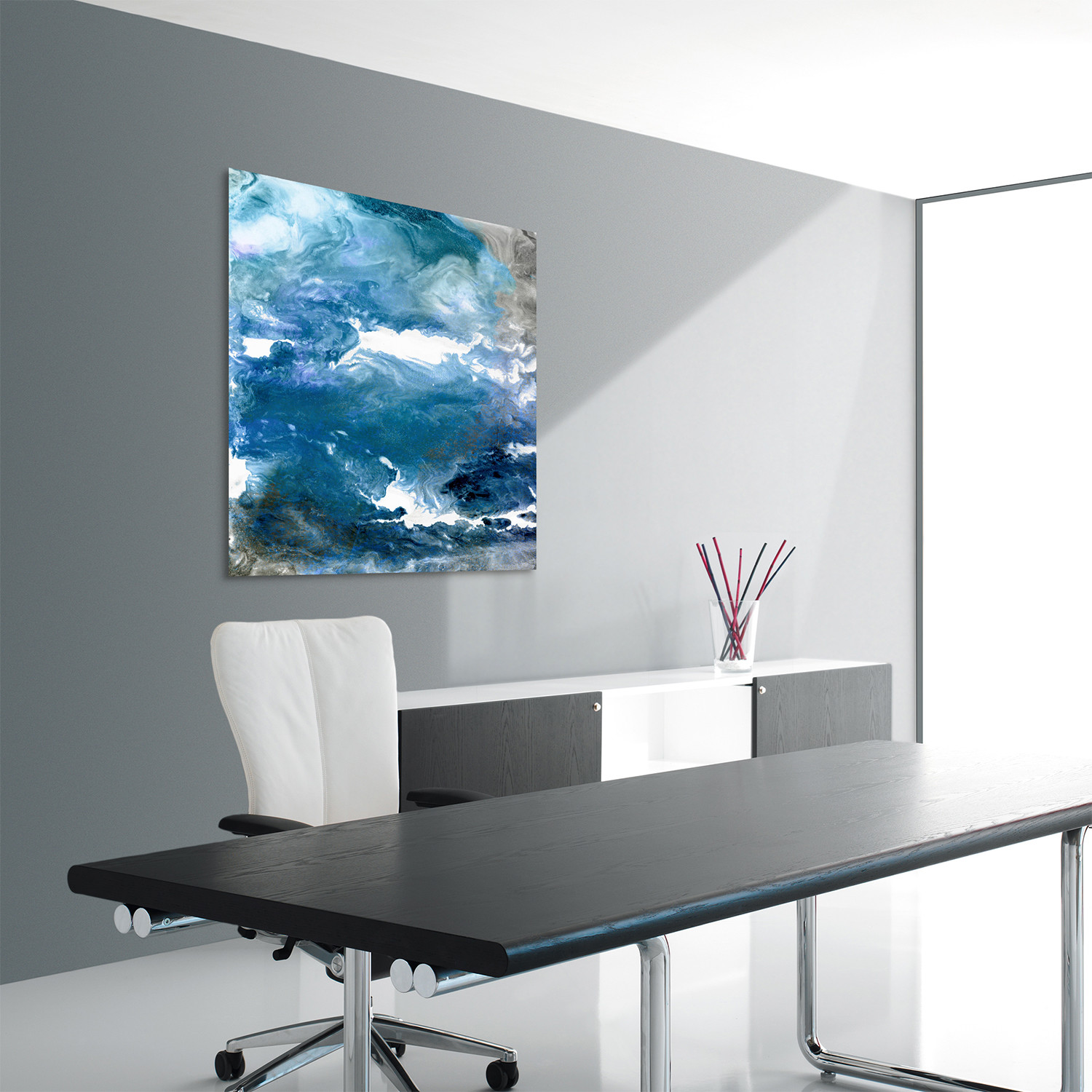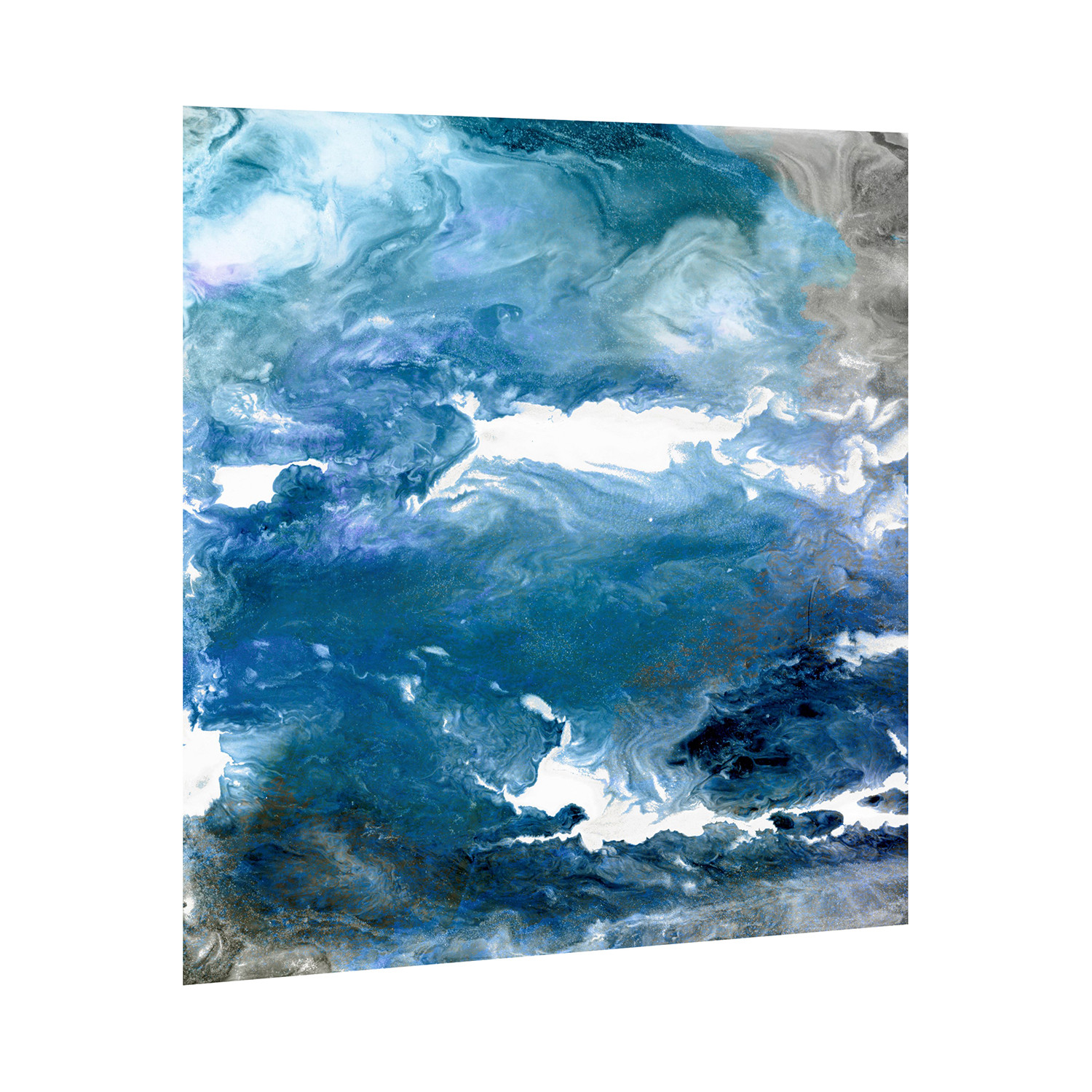 A shifting melee of colours is present in this image, Glistening Tide, which seems like the swirling and churning of some cosmic empyrean. Patches of pure white break through from rich blues like sunlight breaking through clouds, while the blues hide a huge array of beautiful tones. The addition of clouds of silver, picked out by silver leaf, underline the otherworldliness of this strange image, while adding a third dimension of contrast.