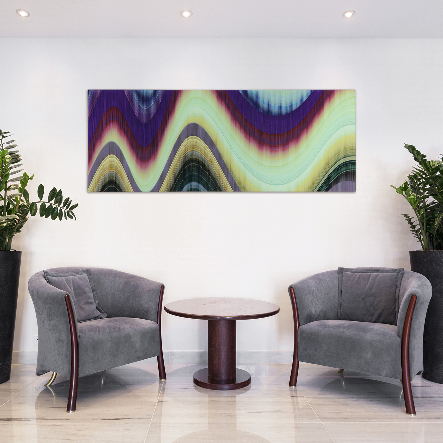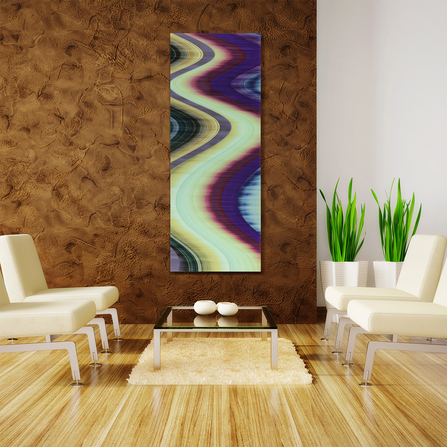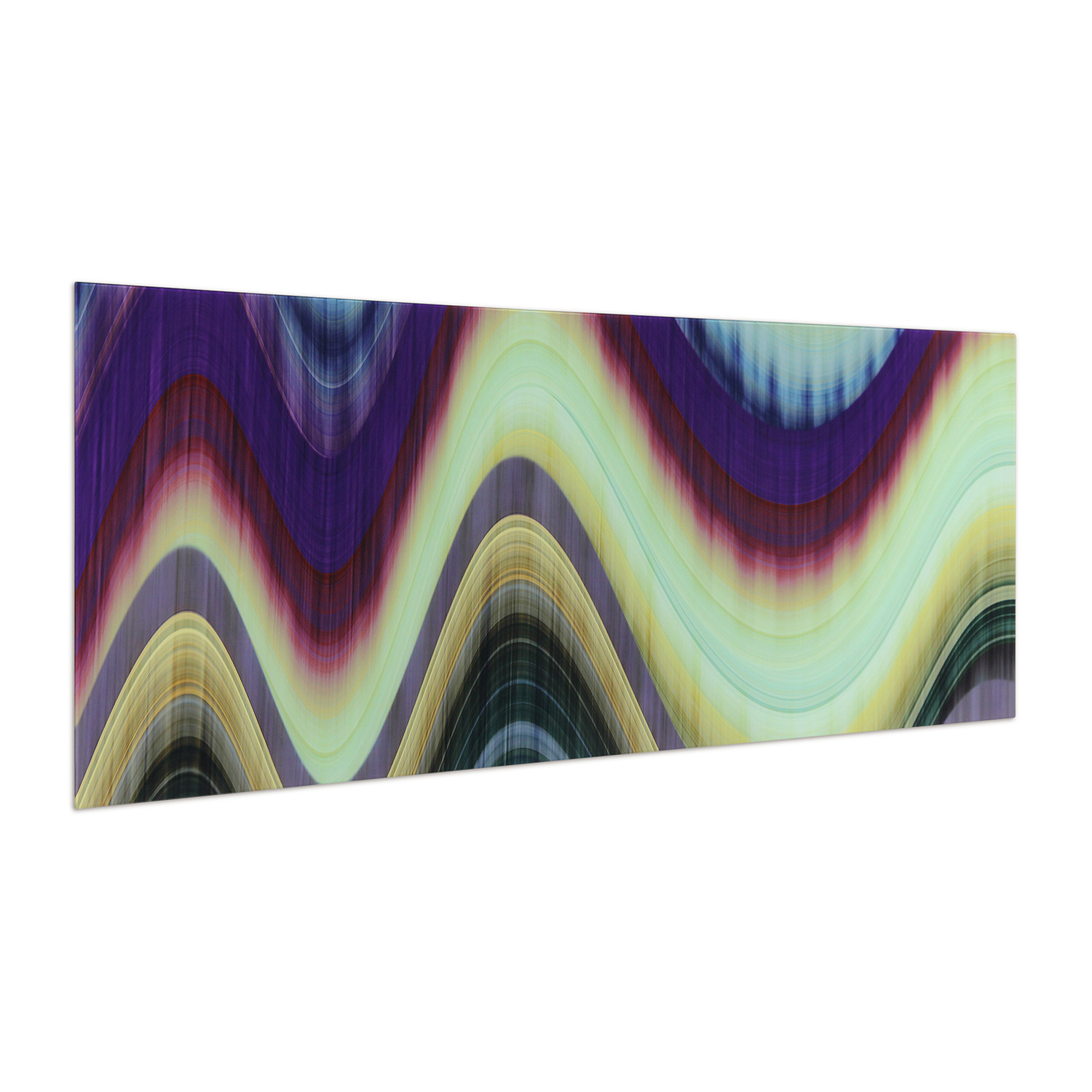 Another in the spacey Rumba series, this piece features vivid, multi-colored stripes. The technique of painting one side of a piece of glass and then viewing it from the other effectively brings out the many colors in this otherworldly looking piece. The viewer may be transported to many places in their respective minds as this abstract piece is open to interpretation. It could be the northern lights to some or bring to mind a lava lamp to others. It is definitely a great addition to any modern art motif.