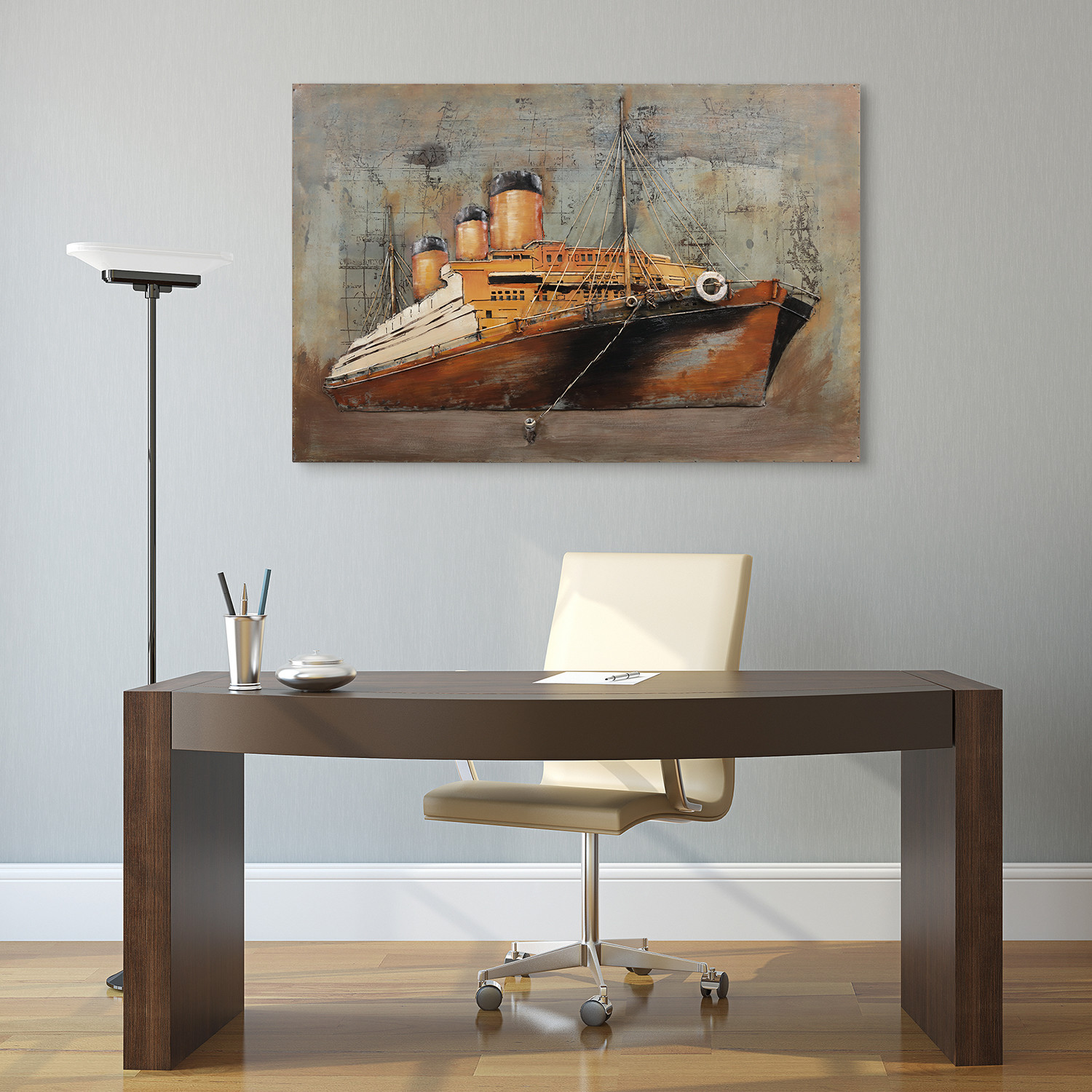 Primo is proud to present this 3D mixed media iron wall sculpture. Each unique original is hand painted and signed by the artist, beautifully demonstrating his incredible skill for manipulating iron into textured works of art with extraordinary depth. This 3D sculpture of a huge ship can be presented outdoors if it is varnished every year, as it will take on a patina characteristic that is inherent in its presentation.