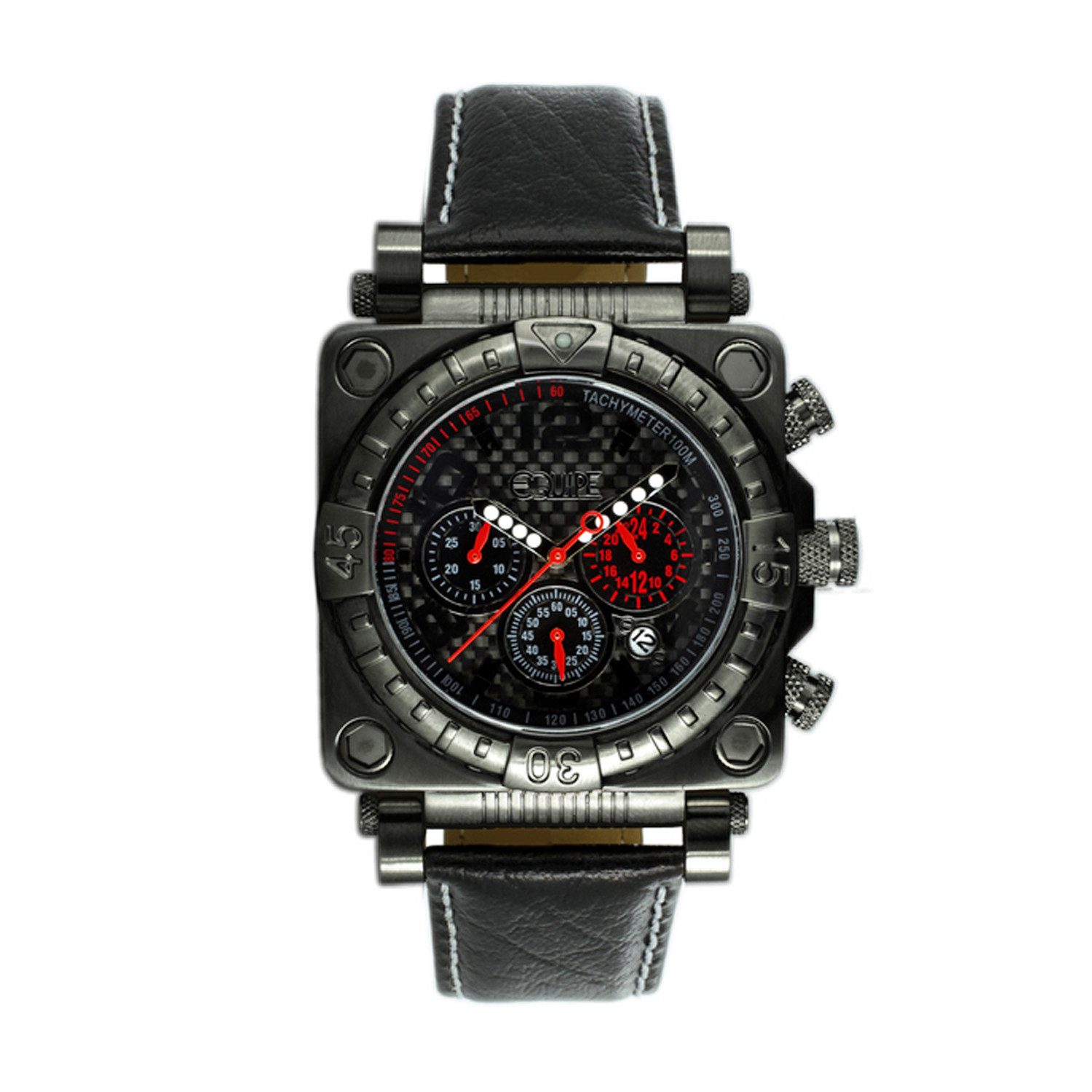 The bold square-shaped Equipe Gasket chronograph recalls the head gaskets of the finest muscle cars. The carbon-fiber dial appeal and red accents offer an excellent machined look.