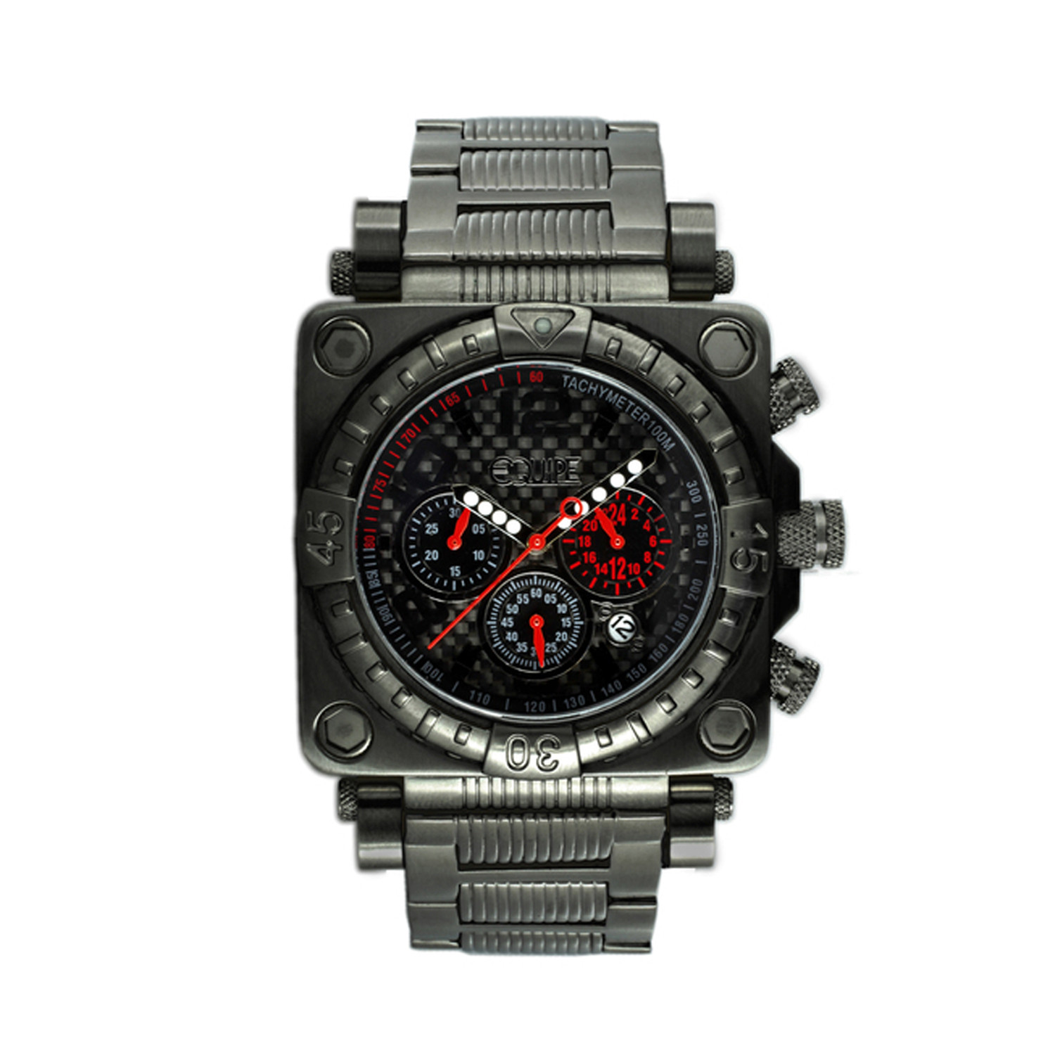 The bold square-shaped Equipe Gasket chronograph recalls the head gaskets of the finest muscle cars. The carbon-fiber dial appeal and red accents offer an excellent machined look.