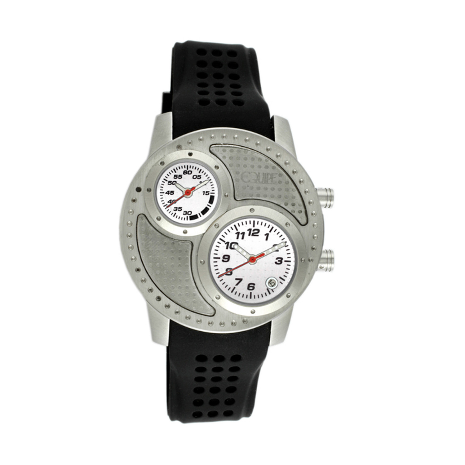 Fueling any car lovers desire to go fast, the round Equipe Octane offers time in two zones. With its striking pierced steel disk back dial, resembling a fly wheel, the watch features two dials that emulate fuel gauges.