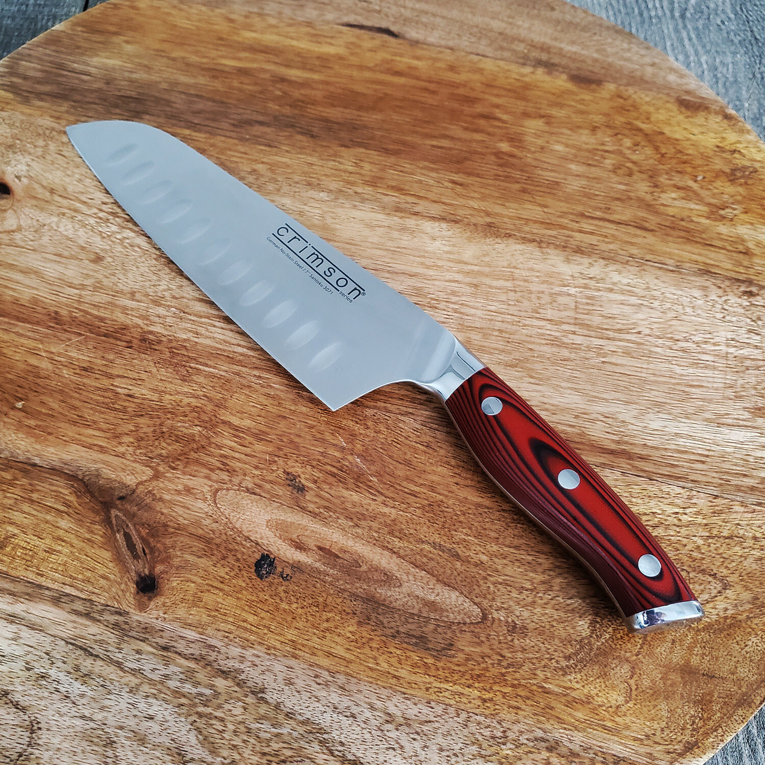 High Carbon German X50CrMoV15 knife blades are heat treated for a long, durable edge life and the set includes a honing steel to keep your edges in alignment for superior performance. Ergo Chef’s Crimson Knife Set with the beautiful bamboo knife block makes a perfect addition to any kitchen.