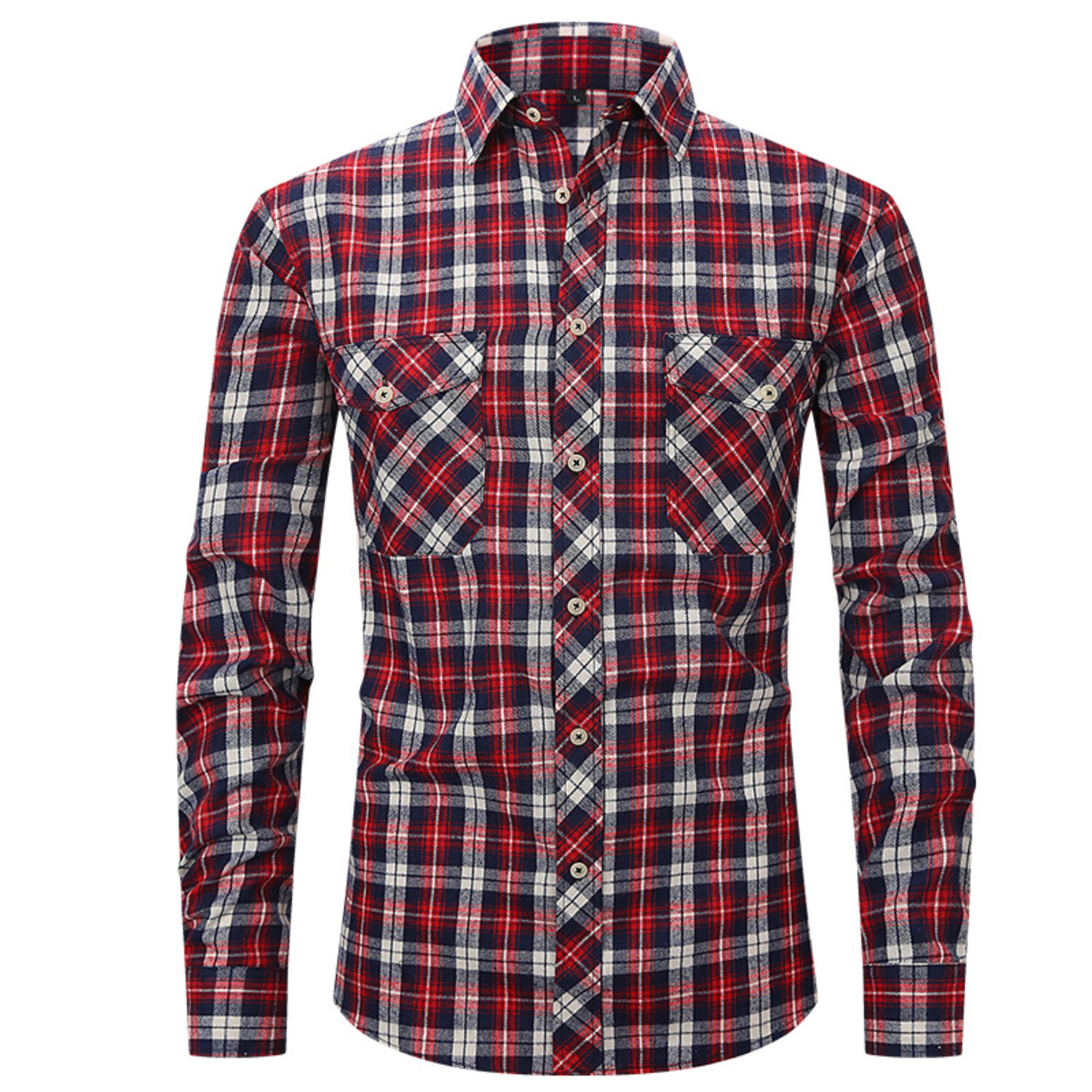 Plaid w/ 2 Front Pockets Long Sleeve Button-Up // Burgundy + Dark Blue