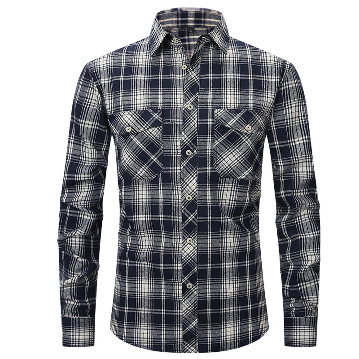 Plaid w/ 2 Front Pockets Long Sleeve Button-Up // Navy + White