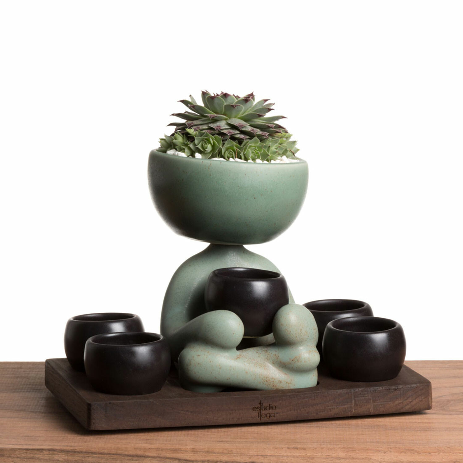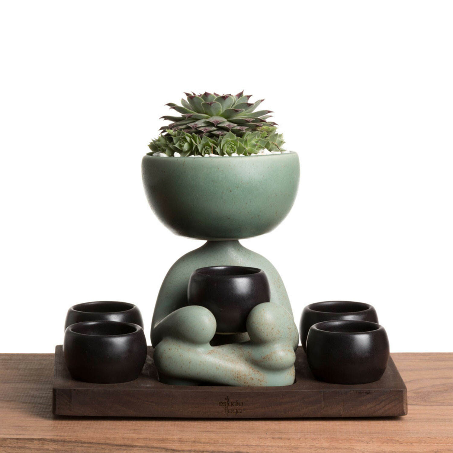 The Drinking Robert Set is part of The Original People's Pot Collection. This unique and eye-catching set includes 5 ceramic shot glasses perfect for serving tequila or mezcal, along with a matching decorative Robert Plant Pot and a wooden base. Its minimalistic style and top-quality materials make it a beautiful piece for any bar, desk, or dining table.