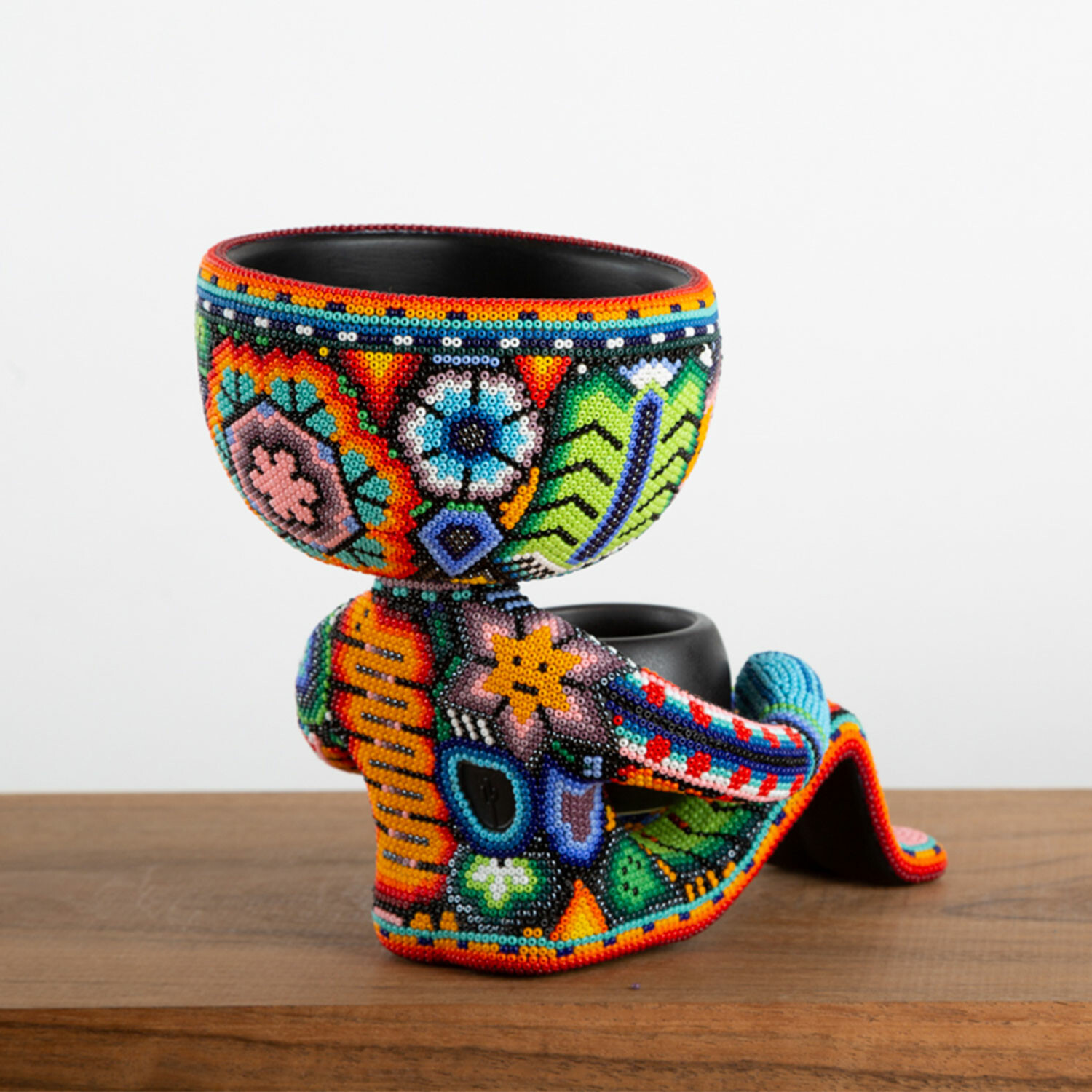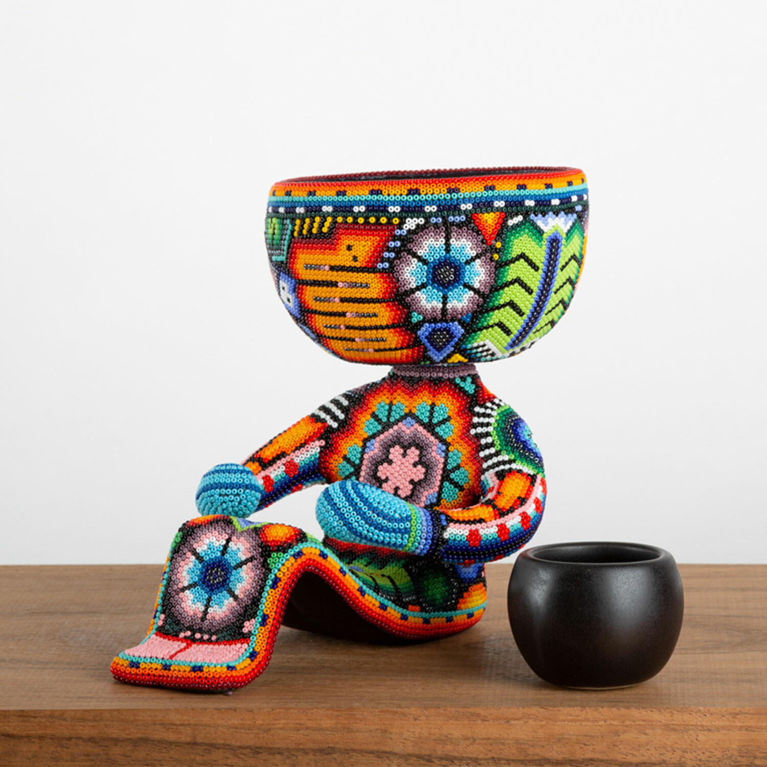This limited edition Huichol version is a unique piece enhanced with intricate beadwork created by Wixárika artisans from San Andrés, Jalisco. These artisans skillfully adhere each bead by hand with beeswax, one by one, to create a stunning pattern that's truly one of a kind.