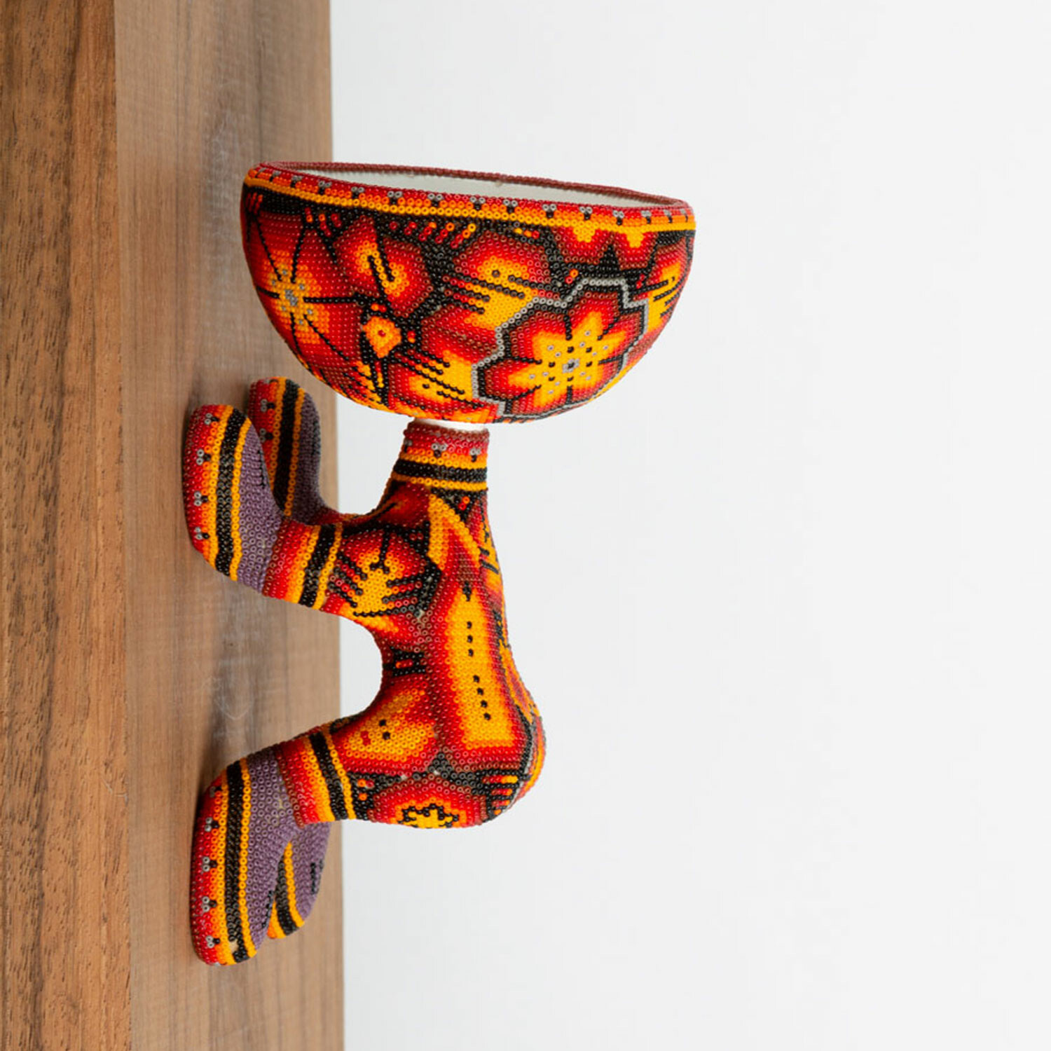 This limited edition Huichol version is a unique piece enhanced with intricate beadwork created by Wixárika artisans from San Andrés, Jalisco. These artisans skillfully adhere each bead by hand with beeswax, one by one, to create a stunning pattern that's truly one of a kind.