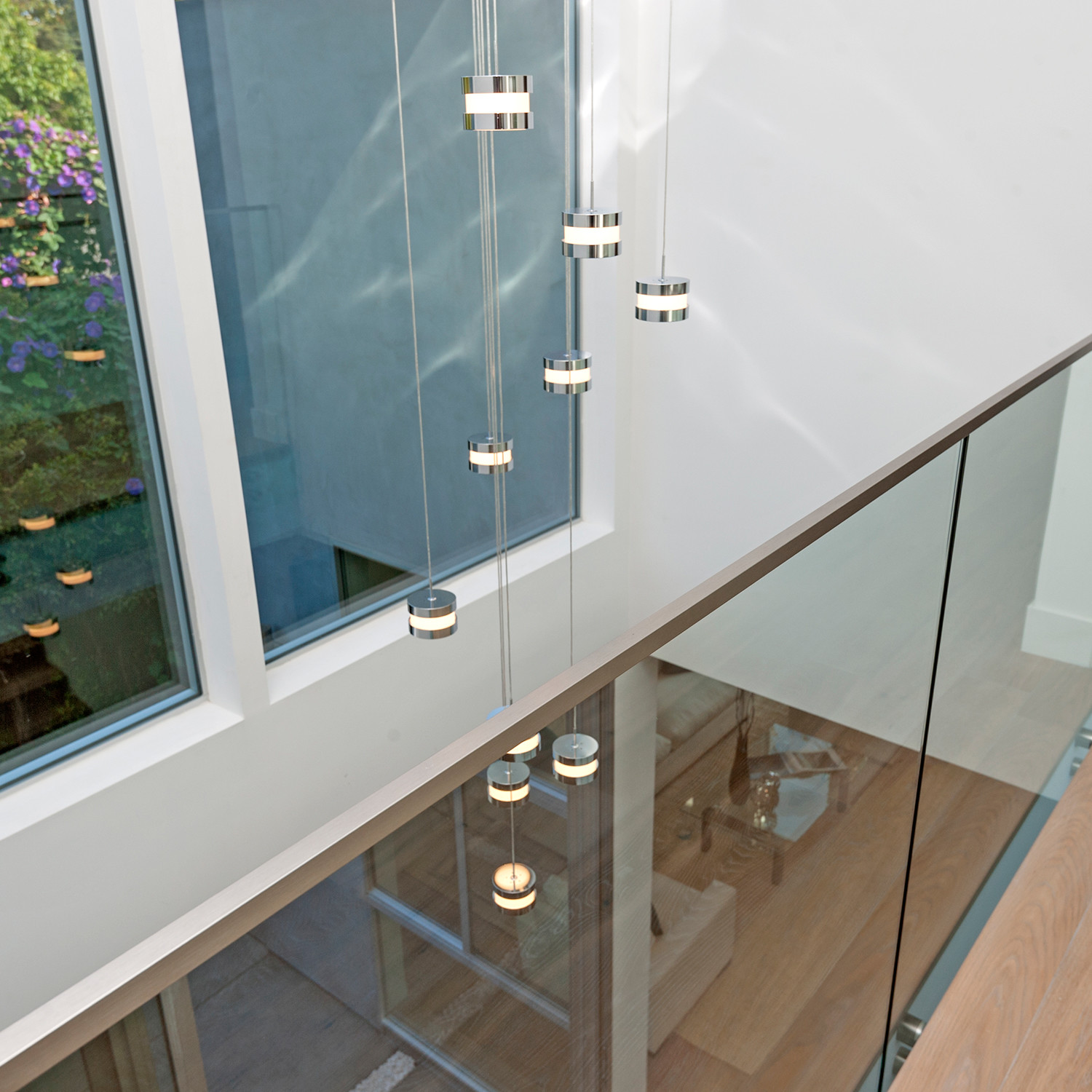 Double bands of Polished Chrome encase drum shaped White glass shades. A warm 3000K light is created by use of long life 4.8 watt Philips LEDs. Available in several configurations, each fixture is easily adjustable for interesting design potentials.