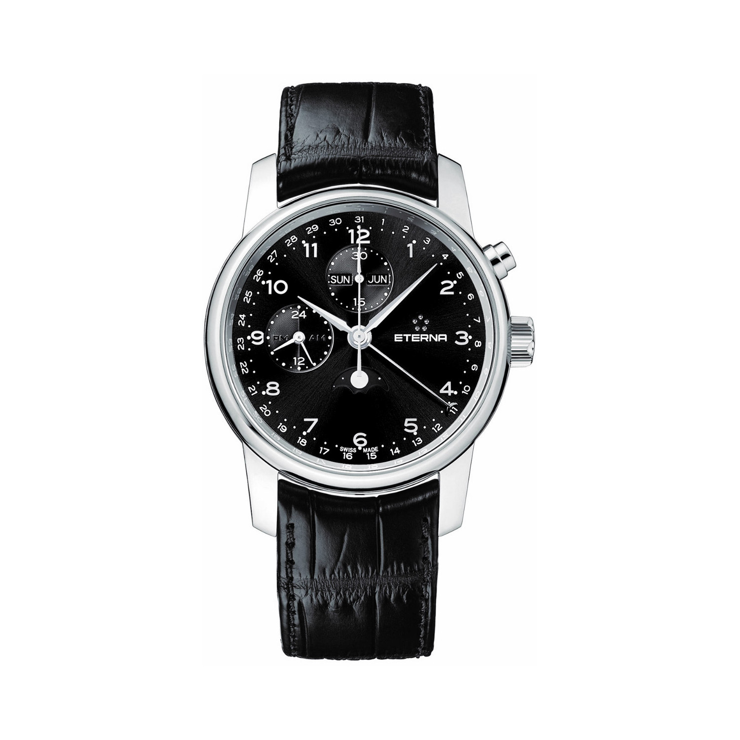 Sleek silver and black leather make the Eterna Men's Soleure Moon Phase Chronograph a modern twist on classic elegance. This handsome timepiece features a large stainless steel case and smooth round bezel, drawing the eye down towards the silver hour, minute, and seconds hands ticking on the silver dial. A large button on the right side of the case works the stopwatch function, shown on the dial by the topmost hand covered in dark blue. Two subdials near the nine and 12 o'clock hours feature the day, month, and military time, while a small blue shape above the six o'clock displays the various moon phases.