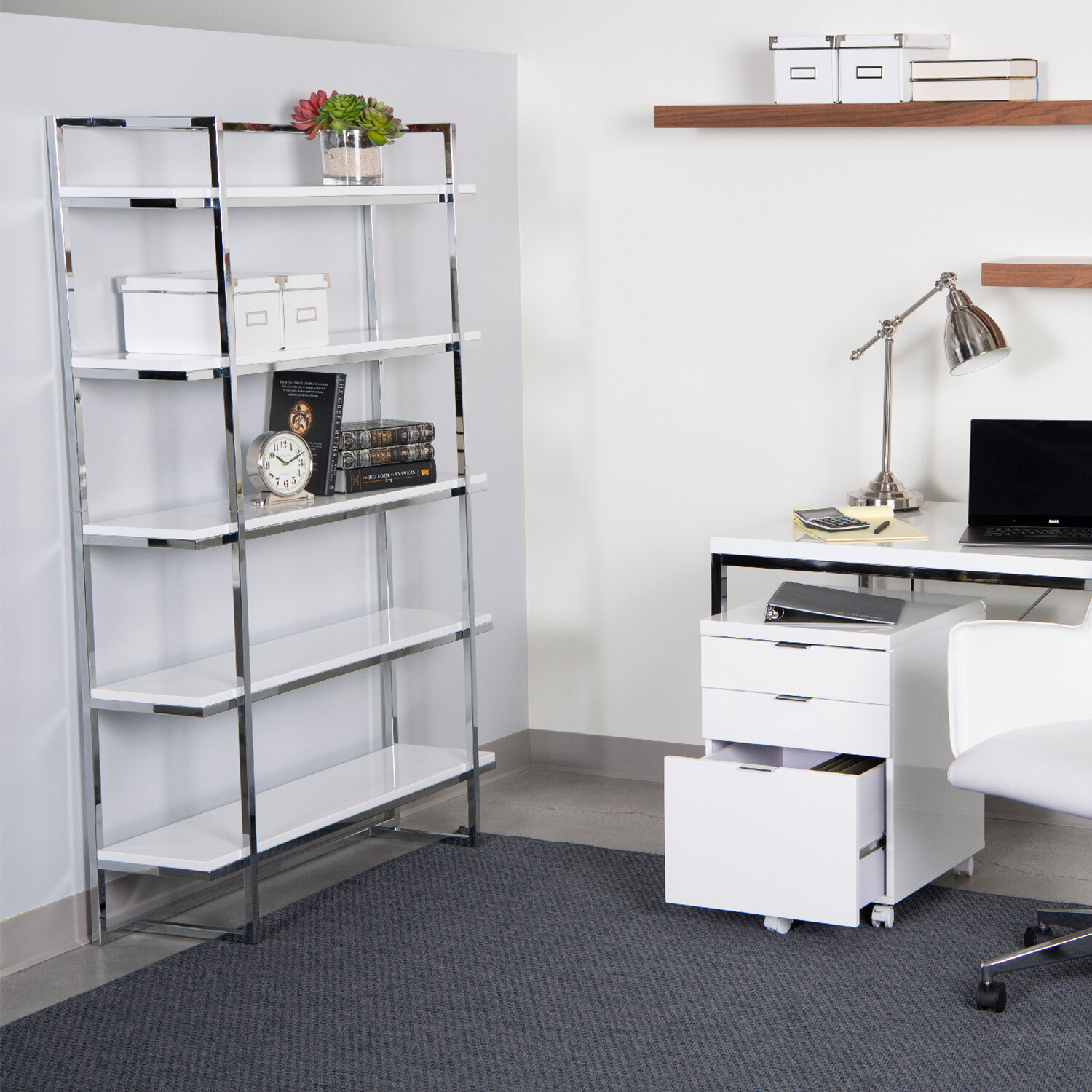 Strength and functionality come together in the Gilbert 5-Shelf Unit. This is an essential office piece that is hard-working, long-lasting, and a no-nonsense classic that really makes a statement. The strong exposed steel frame is chromed and supports high gloss shelving. The sleek, simple silhouette is perfect for any home or office.