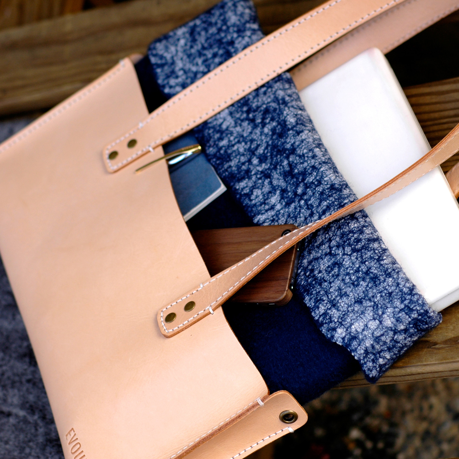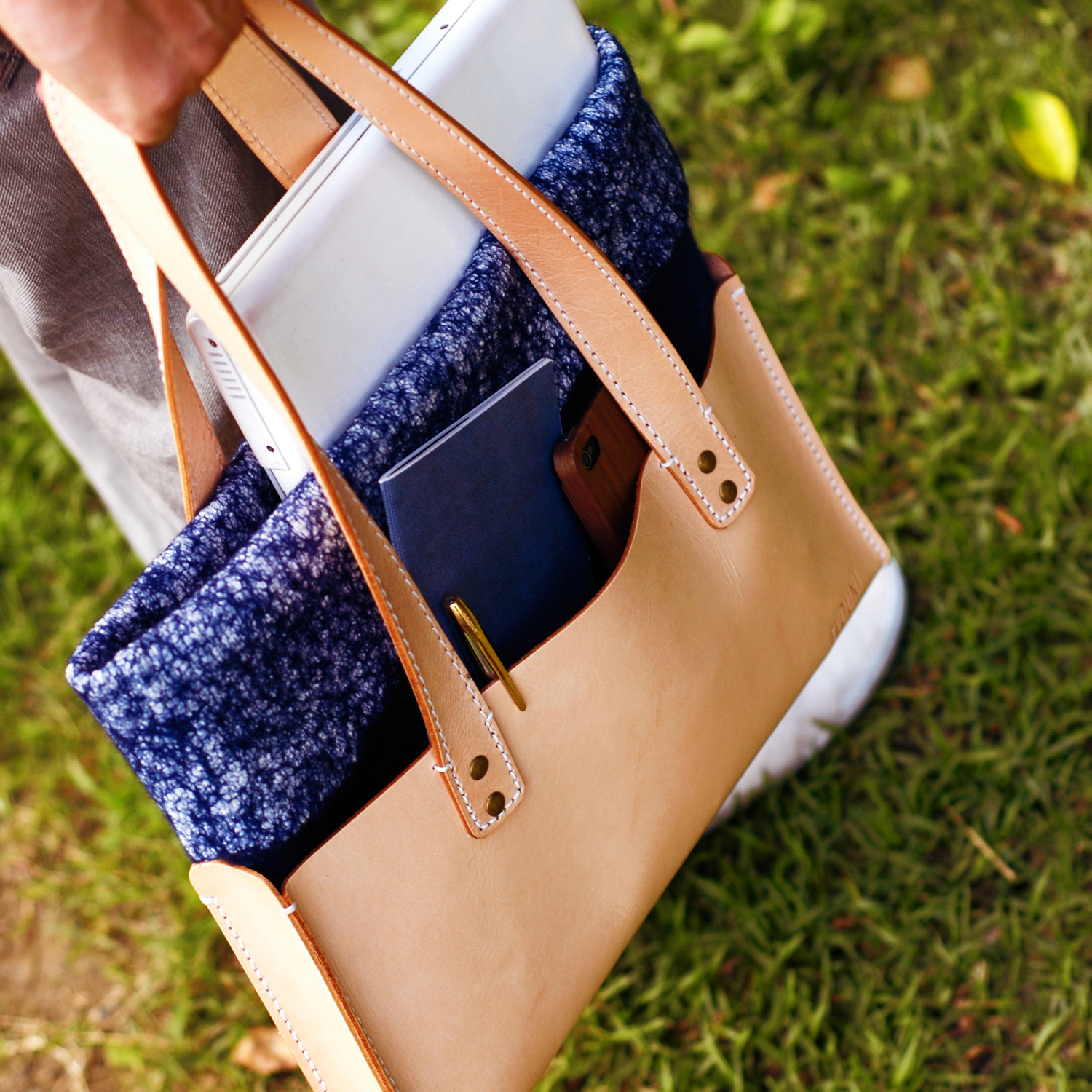 This handsome leather tote bag boasts a built-in wool laptop pocket to keep your computer protected with panache. It's great when you're on the go—just tuck your 13" laptop or tablet into the sleeve and it'll stay protected all day and night long.