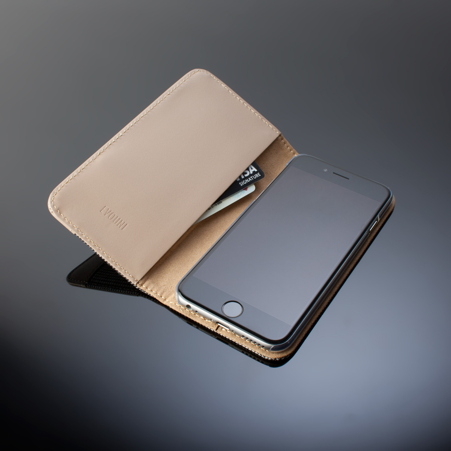 This elegant wallet encases and protects your iPhone, all while keeping your cards and change handy. With a built-in stand function that allows you to view your iPhone 6 or 6 Plus at various angles, a durable, dyed Japanese nano twill exterior, and a large interior pocket for storing your essentials, it reduces what you have to carry around to a minimum â and does it stylishly.