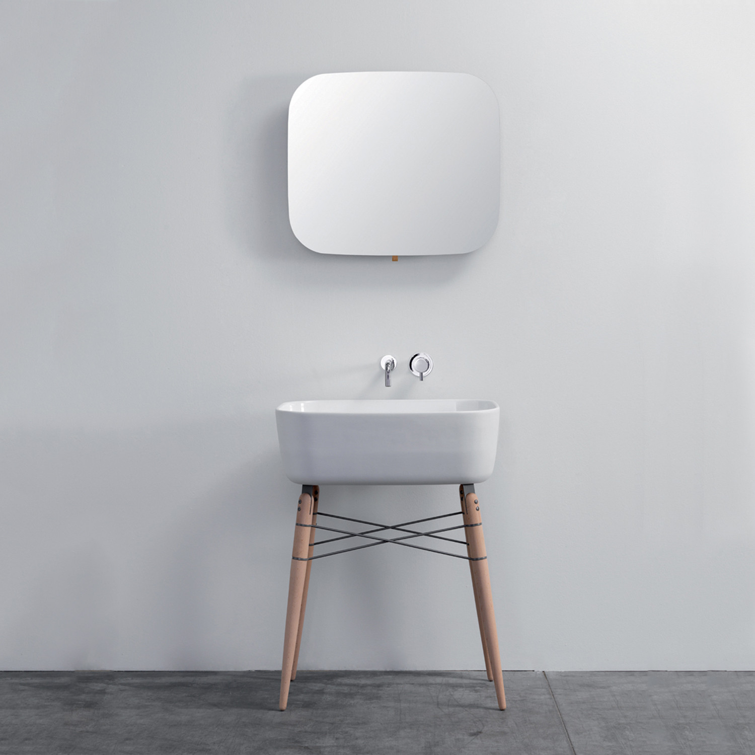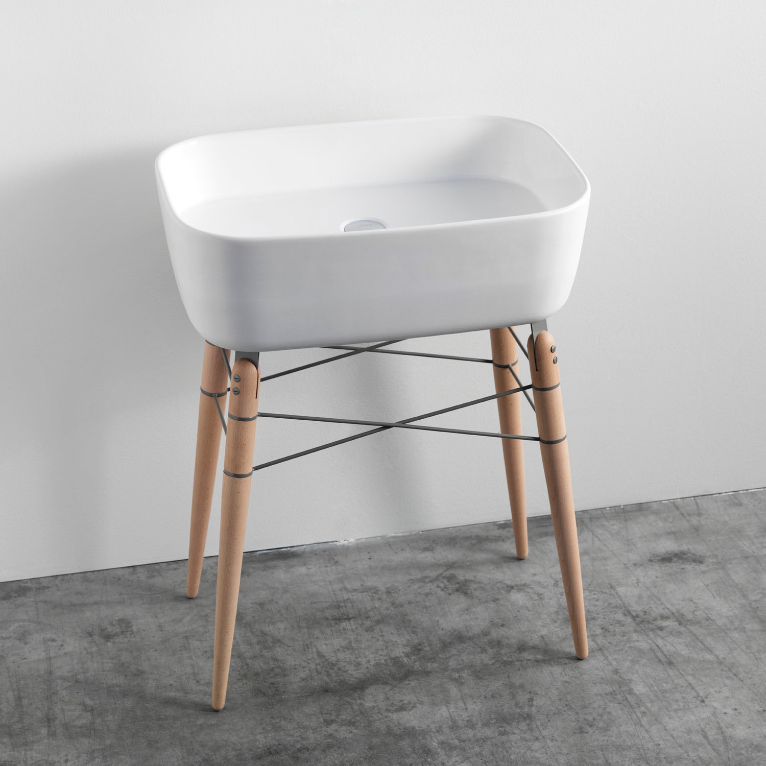 This German Design Award nominee combines a simple, functional basin with wooden legs that are braced by varnished steel wires. Hang towels or rags from the support structure, and use the basin for all your washing up needs. The piece is designed to complement the Ray Mirror.