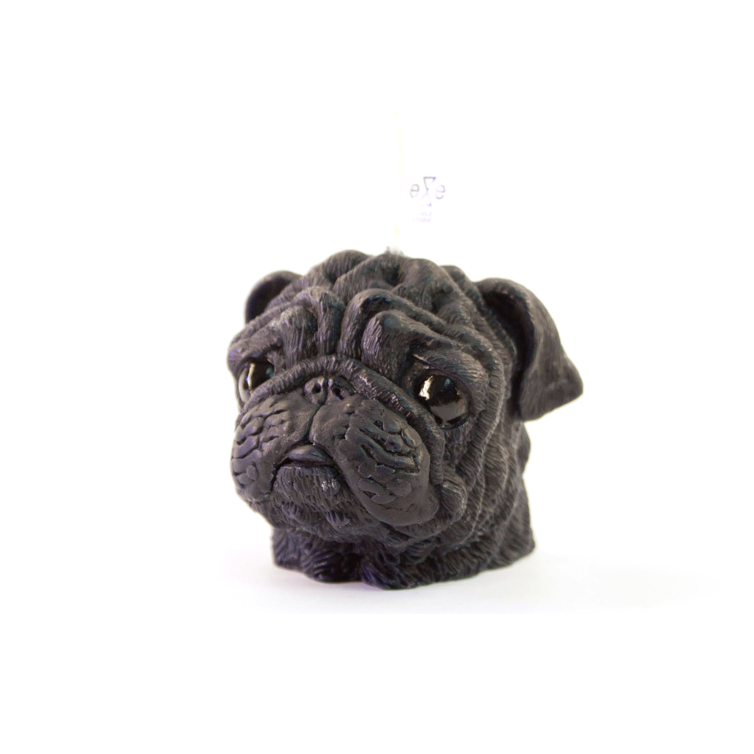 The Pug Candle’s eyes and playful tongue were treated with special coating to emphasize their cute trademark features. The two way placement design displays the special glass inlay used to highlight the breed’s face from multiple angles. With eyes made from colored beaded glass, the candle offers a vivid, realistic gaze, and reflect glimpses of the candle flame when burning in the dark.