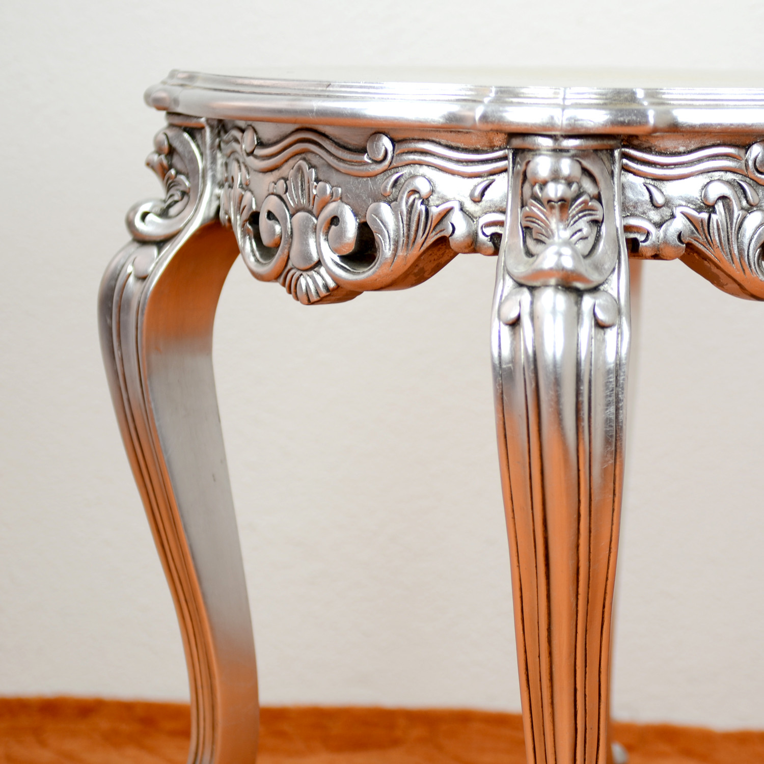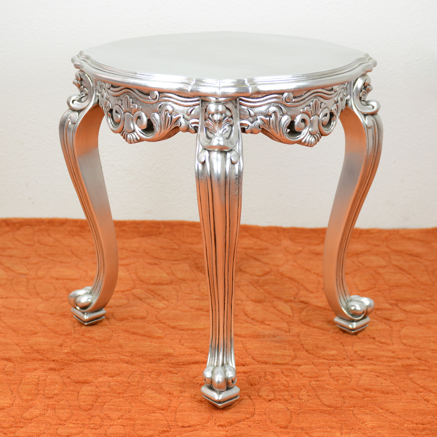 This hand-carved, solid mahogany side table is refined and lovely with silver leaf finish. It's luxurious and unexpected in your home.