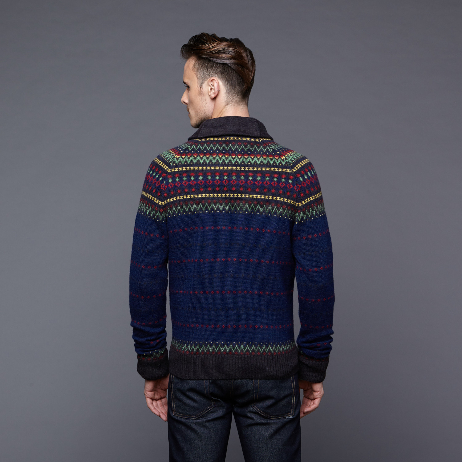 This Falcon Wool Knit Zip Sweater is a perfect Winter staple. Done in a thick Fair Isle-knit wool, with a zip closure, shawl collar, and knit pockets, it will get you through months of cold weather with East Coast style and ease.