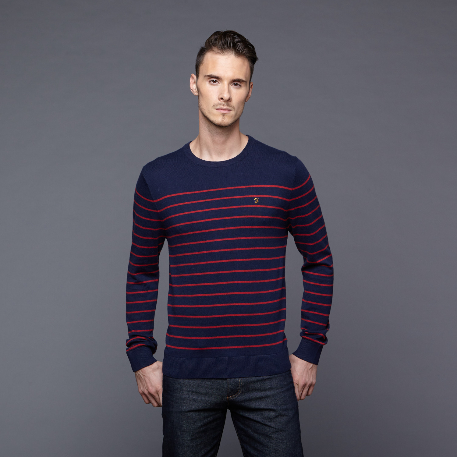 This Jefferson Crew Neck Sweater is a perfect Winter staple. Done in a knit wool, with horizontal stripes and the signature embroidered "F" at the chest, it will get you through months of cold weather with preppy style and ease.