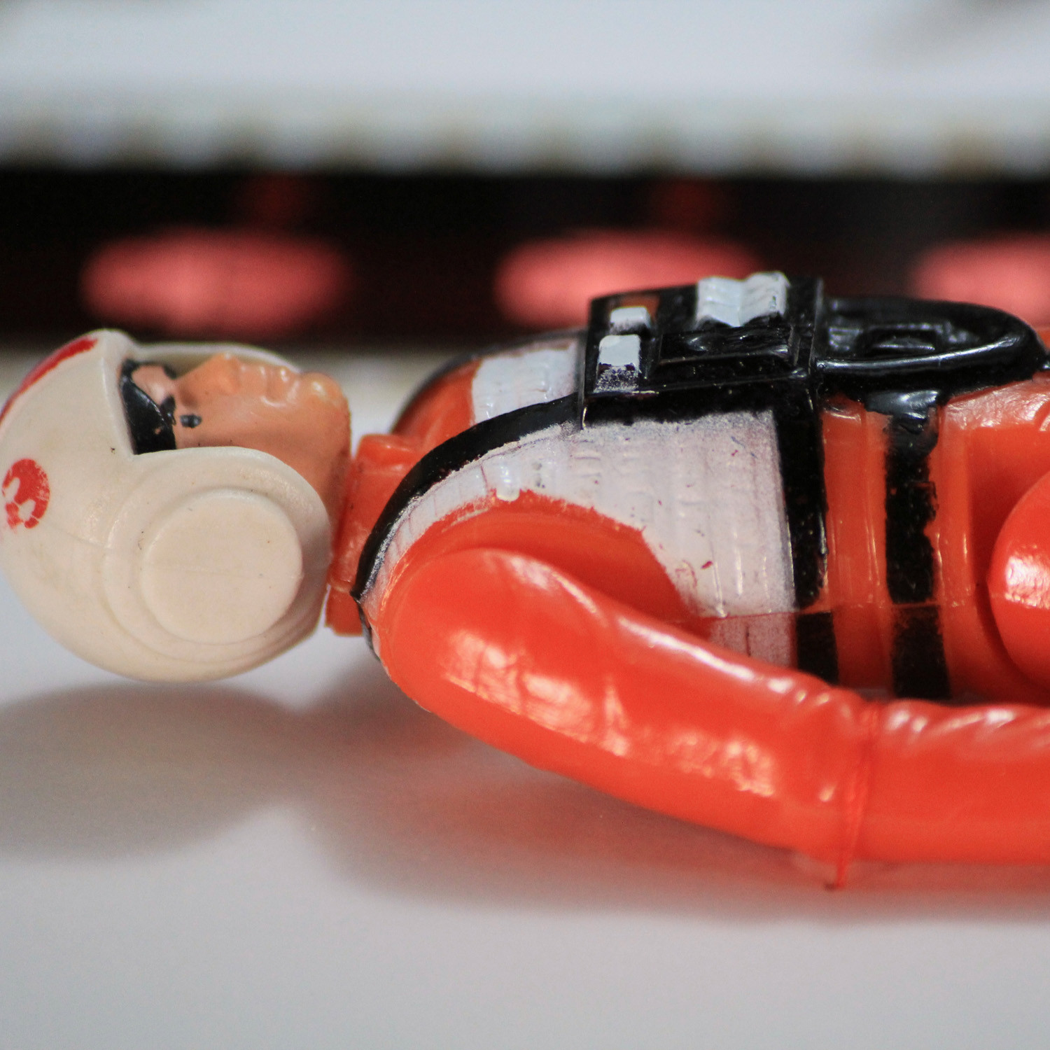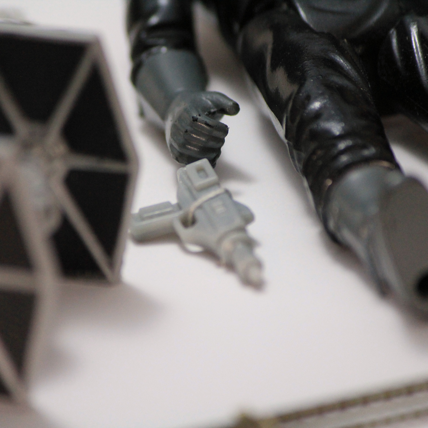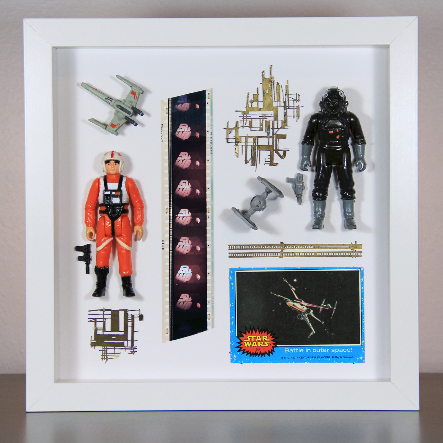 This display features vintage Luke Skywalker as an X-Wing pilot and a TIE fighter pilot, with their Micro Machine ships and Topps trading card illustrating them locked in a dogfight, framed by three large metal Death Star II sections that were pulled from the ILM model shop almost four decades ago.