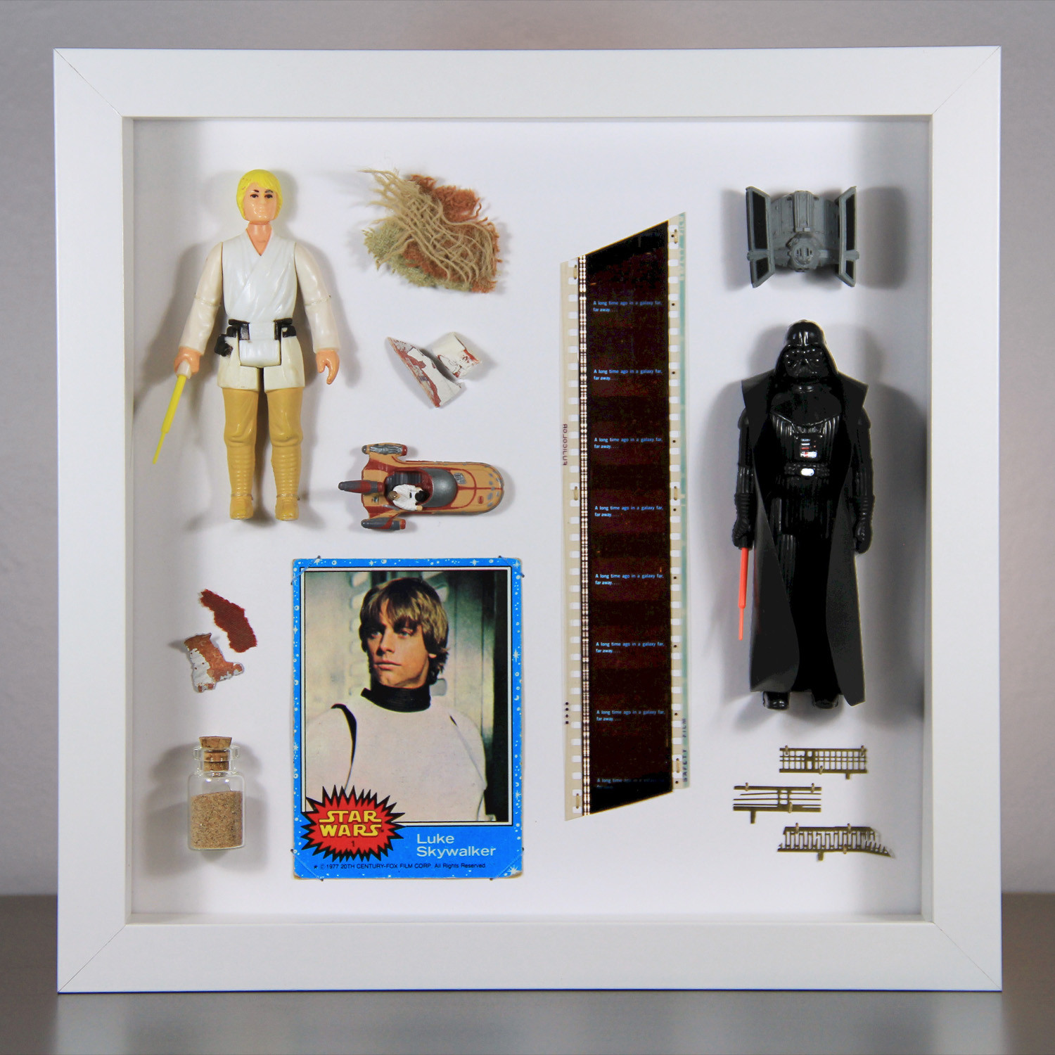 Handcrafted using treasures and rarities from the Star Wars universe, Faraway Vintage displays feature selections of screen-used props, set decoration swatches, film location elements, vintage Kenner action figures, Galoob Micro Machines, original Topps trading cards, and first-run 35mm film.