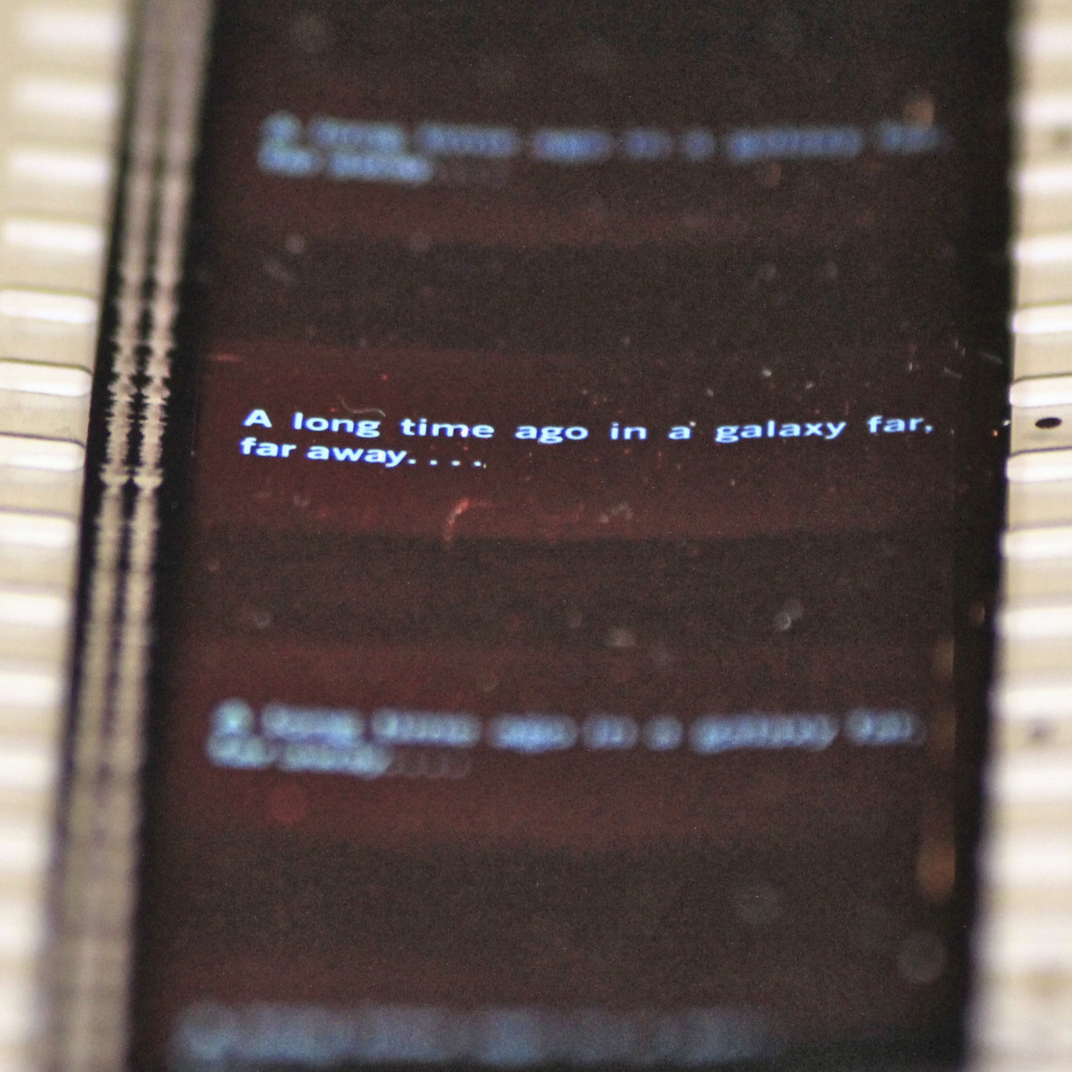 This display features vintage Luke Skywalker and Darth Vader, metal Death Star II sections pulled from the ILM model shop almost four decades ago, a piece of screen-used Jabba’s Sail Barge, Dune Sea sand, screen-used vaporator fragments, screen-used fabric and scrap from Tunisian sets that acted as locations for the desert planet Tatooine, Star Wars #1 trading card, and those famous opening words on 35mm film.